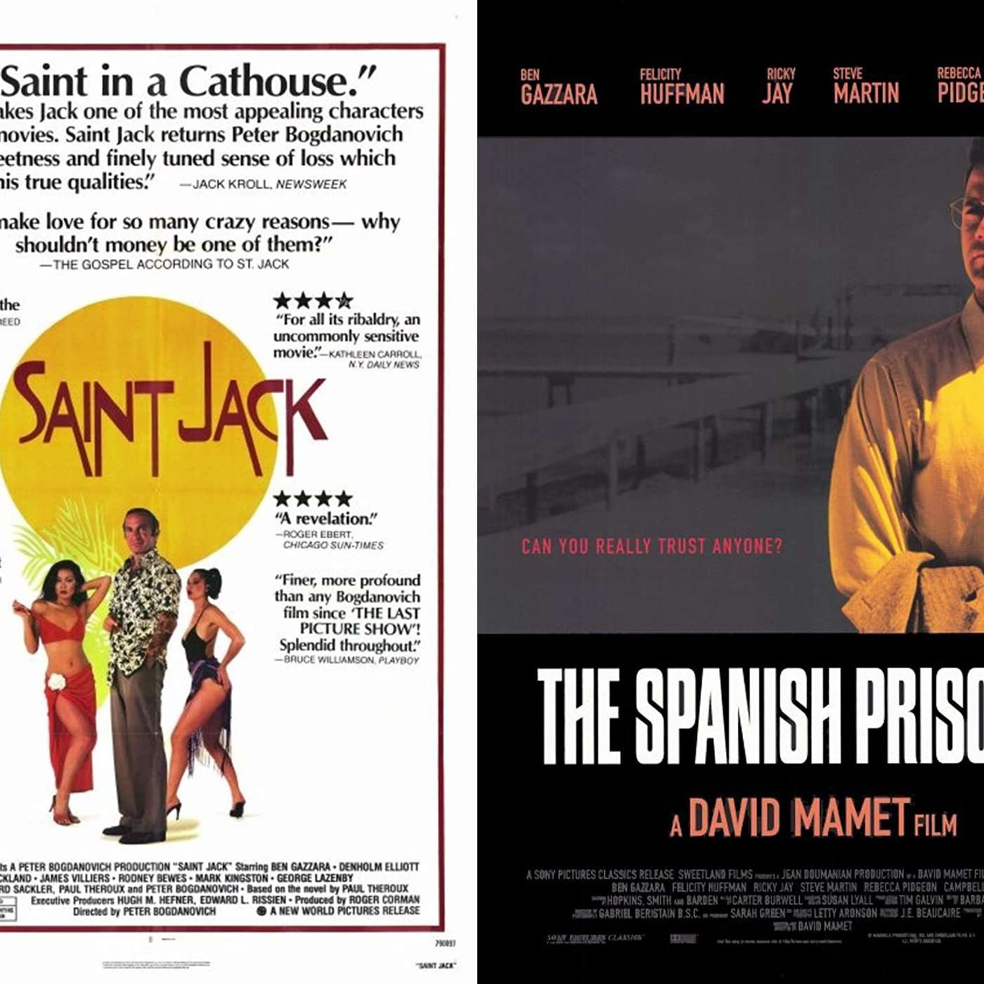 We celebrate Ben Gazzara - sort of. First up is "Saint Jack" (1979), a wonderful Peter Bogdanovich film that seems to be written for Gazzara. The story of an American wanting nothing more than to open a brothel in Singapore. We loved this film and agree that it is as underrated as they come. Our second feature is not really a Ben Gazzara film, but he's in it for a brief time. David Mamet's "The Spanish Prisoner" (1997) is another con-artist yarn that is boring, miscast and extremely predictable.