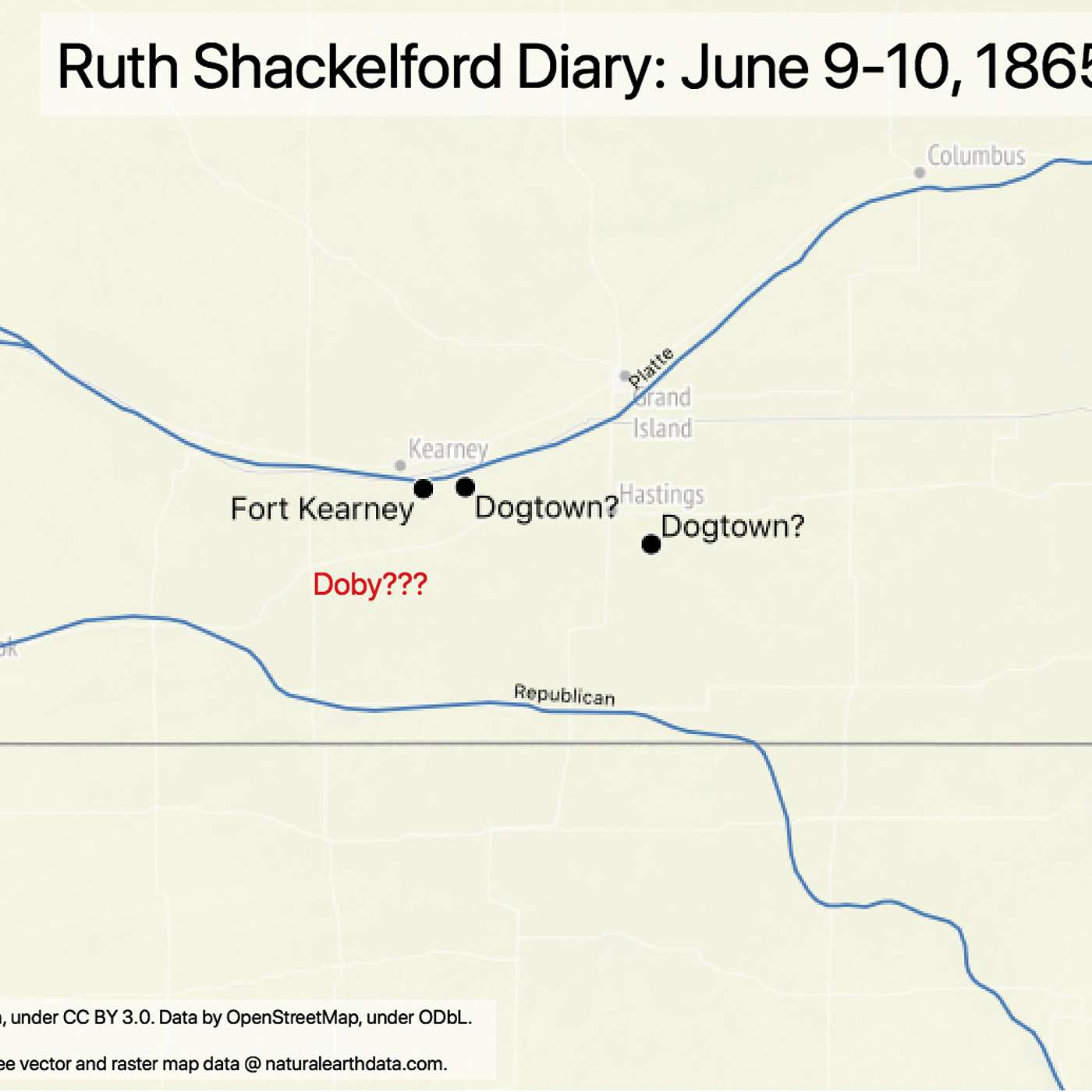 The Shackelfords traveled near Fort Kearney on June 9-10, 1865 and passed through the towns of Dogtown and Doby . . . neither of which exist today. In this episode, Jen discusses music along the trail and how she solved the mystery of where Dogtown and Doby were located.