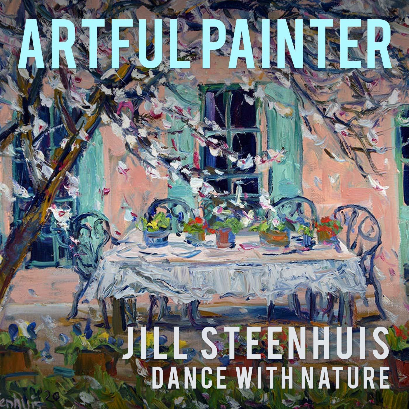 Jill's paintings are vibrant and colorful. Her loose brushstrokes invite the viewer into an intimate dance. Most of her paintings are created outdoors – en plein air. Each painting session begins with a warm-up: she carefully prepares and lays out her colors on a large, white palette that she likens to a piano. Using her "unlimited palette" of colors, she has access to all 88 keys of the piano. With a large canvas set in place on her easel, her eye seeks out the nature that surrounds her. And then, she lifts up a paintbrush and without hesitation, Jill Steenhuis begins her exuberant Dance with Nature.