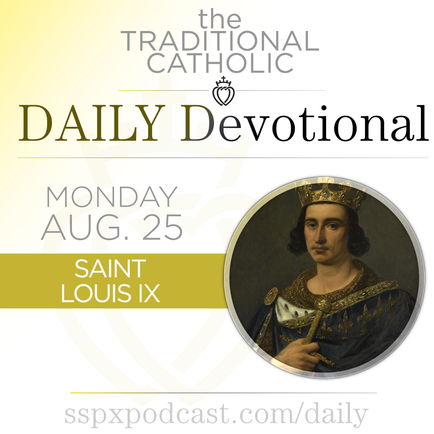 It’s the Feast of St. Louis IX, 2nd Class, with the color of Green. In this episode: the meditation: “Bloody and Unbloody Sacrifice Identified by the Cross”, today’s news from the Church: “2025 SSPX Jubilee Pilgrimage”, a preview of the Sermon: “Three Moments in Our Lady's Life”, and today’s thought from the Archbishop.