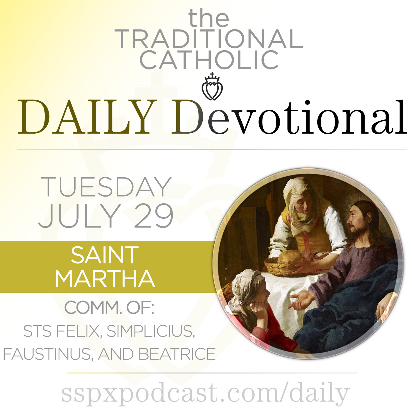 It’s the Feast of St. Martha with a commemoration of Sts Felix, Simplicius, Faustinus, and Beatrice, Martyrs, 3rd Class, with the color of White. In this episode: the meditation: “The Fruit of the Gospel”, today’s news from the Church: “The Pope's Two Crosses”, and today’s thought from the Archbishop.