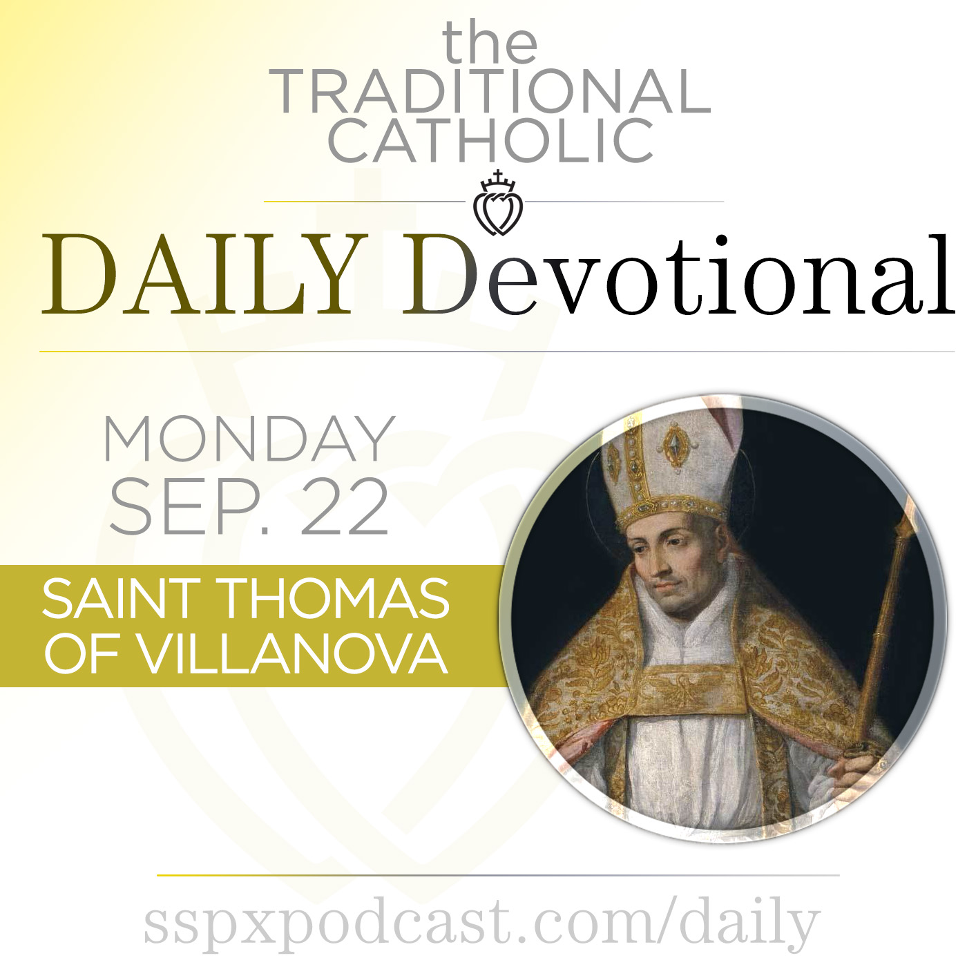 It’s the Feast of St. Thomas of Villanova, 3rd Class, with the color of White. In this episode: the meditation: “The Breaking of the Sacred Host pt II”, today’s news from the Church: “Planned Parenthood Excluded from Medicaid Funding”, a preview of the Sermon: “The Cross Is the Key to Catholicism”, and today’s thought from the Archbishop.