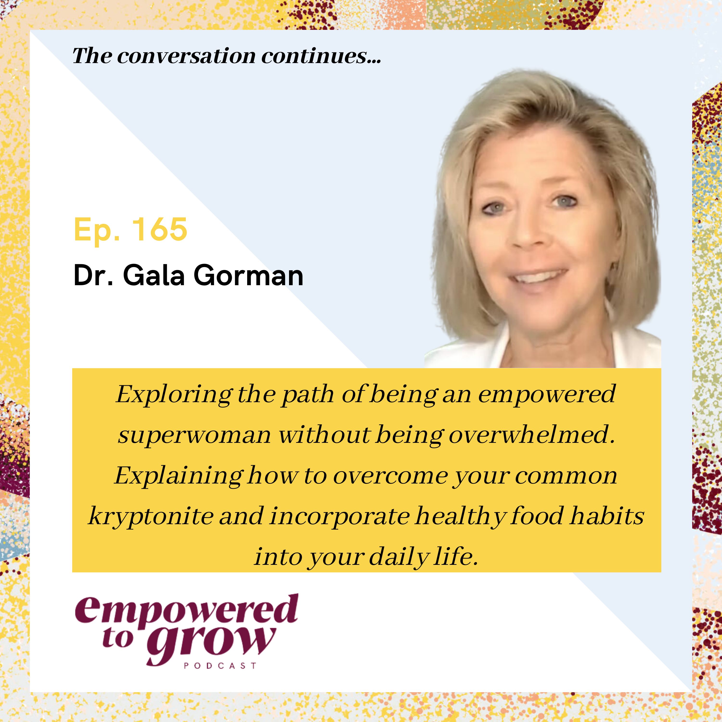 The conversation with Dr. Gala Gorman continues to unchartered waters… Exploring the path of being an empowered superwoman without being overwhelmed. Explaining how to overcome your common kryptonite and incorporate healthy food habits into your daily life.