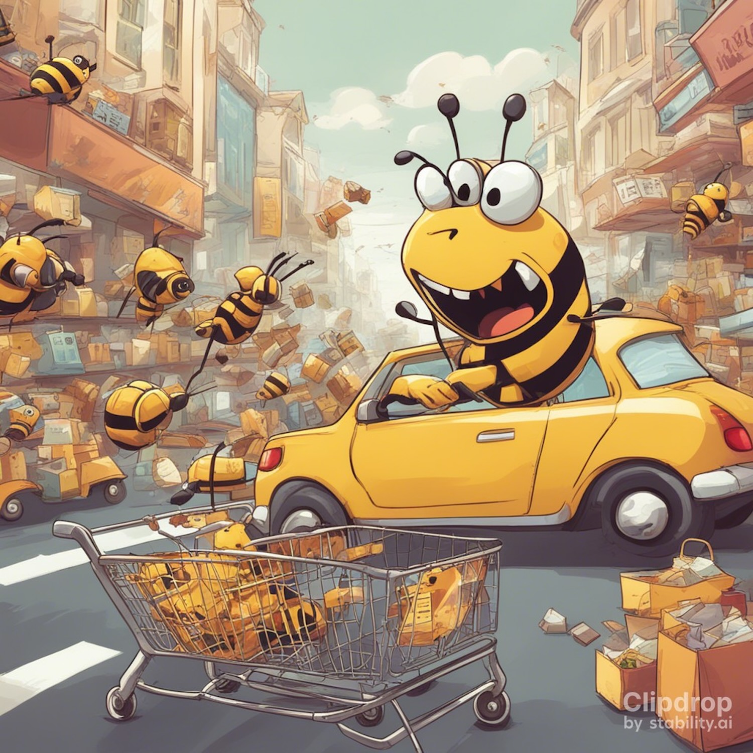 Draw a cartoon bee that is driving a car down the road and crashing into a row of shopping carts.