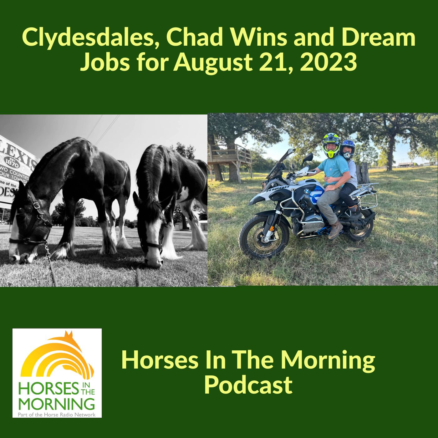 HITM: Kyle Flowers from F&M Clydesdales joins us with a Breed Highlight of the Clydesdale. Sometimes you have to let the spouse win one, dream jobs our listeners have and an update on barn shopping. Listen in…