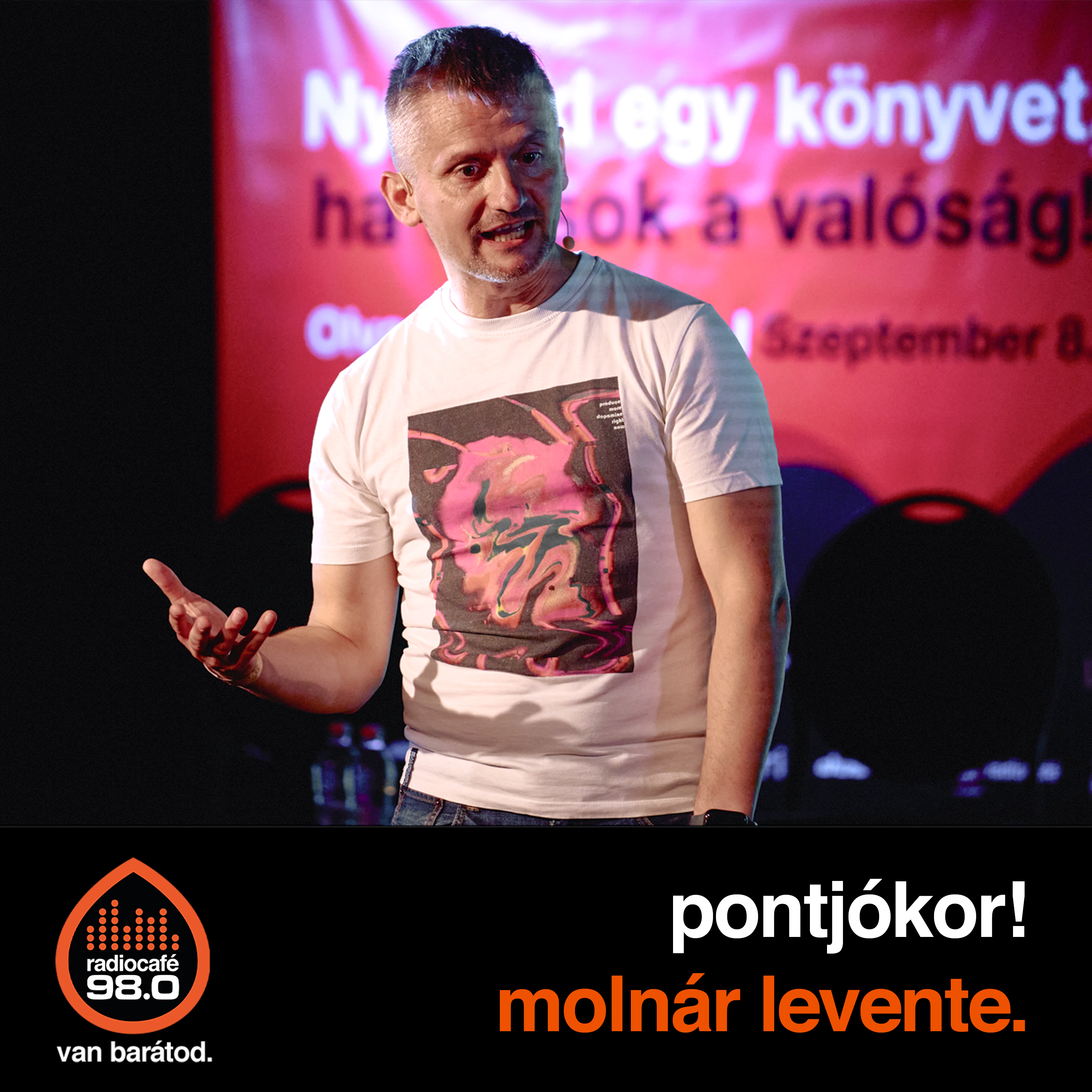 Molnár Levente a pontjókor! vendége, akit a Momentán Társulat így mutat be az oldalán: "az ország talán legnagyobb imprós szakirodalmi könyvtárával rendelkező személye, aki az Egyesült Államoktól Indiáig rengeteg helyen tanult és improvizált együtt másokkal... és akinek az impró az emberekkel való kapcsolódást jelenti". Az idei olvasás világnapján ő mozgatta a közönséget és az előadókat is, így aki ott volt, találkozhatott kifogyhatatlan játékos kedvével. Gyerekkora óta szinkronizál, filmeket és sorozatokat fordít, szuperhősrajongó, képregénygyűjtő, imprótréner, három gyermek apukája, aki itthon és külföldön is nagy sikerrel játszik.