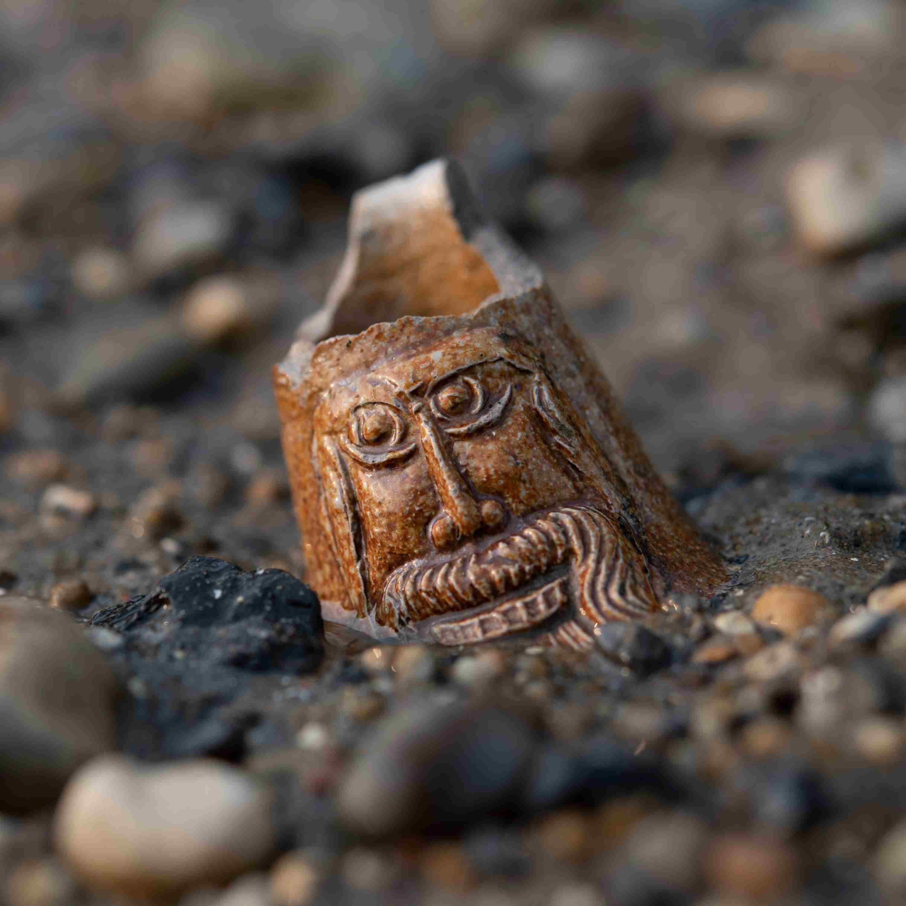 The photograph used to illustrate this podcast is © Alessio Checconi /London Museum. It shows the neck from a stoneware bottle with a bearded face known as a Bartmann bottle 1500s – 1600s. The bearded face decorating the neck lies half-buried on the foreshore.