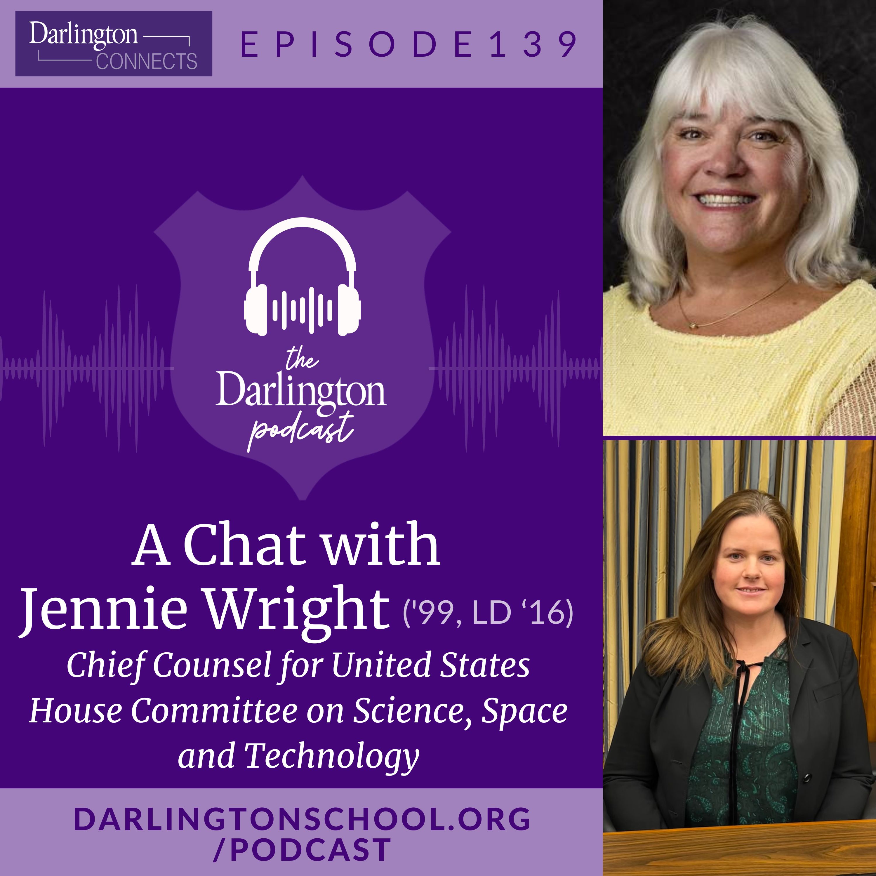 In this episode, Director of Alumni Relations Vicki Vincent chats with Jennie Wright ('99, LD '16) about her family legacy at Darlington, her experience as a boarding student and her career journey that led her to her current role as chief counsel for the United States House Committee on Science, Space and Technology.