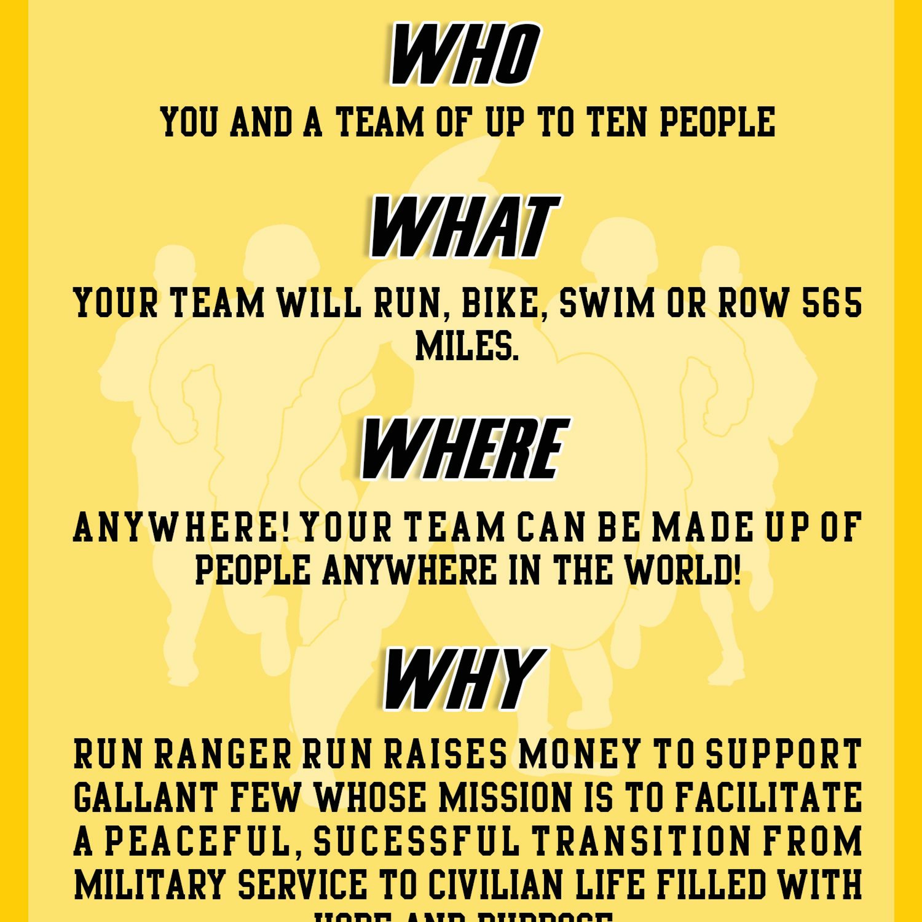 Last year, the F3 Nation came through BIG TIME and raised over $10,000 for Run Ranger Run. This year we are aiming even higher, but your responsibility is less #notfakemath. The goal for this year is for multiple regions to form teams and each knock out the 565 miles. That’s. It. $28 of your $35 registration goes to GallantFew. That means each team of 10 raises $280 by just, signing, up.