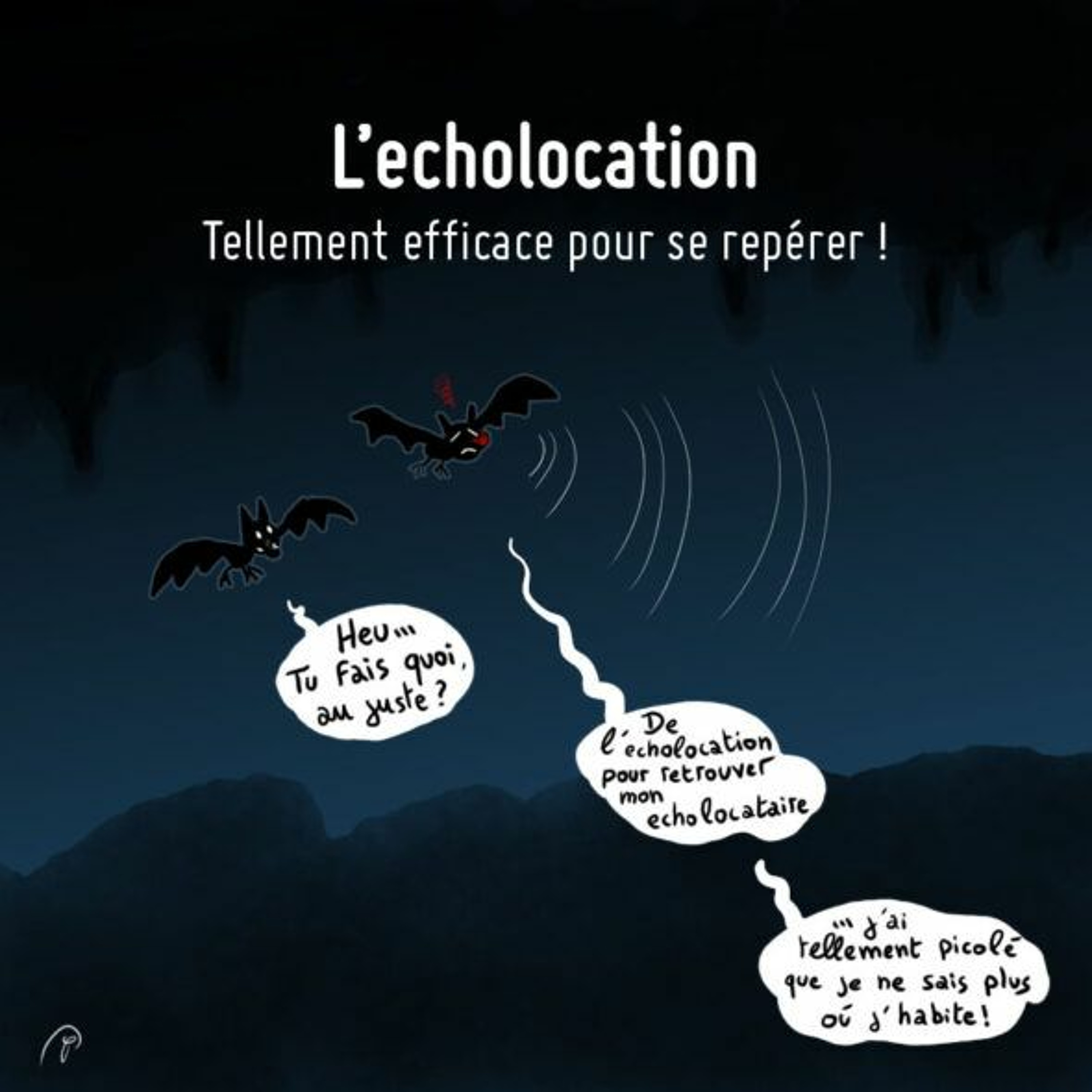 Ce soir on parle des colocations. Oui ces endroits où la vaisselle n’est jamais faite, que les jeunes font pour gagner de l’argent. Hein quoi ? Ah non j’ai mal compris on va parler d’écholocation pas des colocations. Les chauves souris, les radars, pas la vaisselle ! Ce soir laissez vous guider par les voix d’Elea et d’Alexa, qui vont vous apprendre à voir dans le noir.