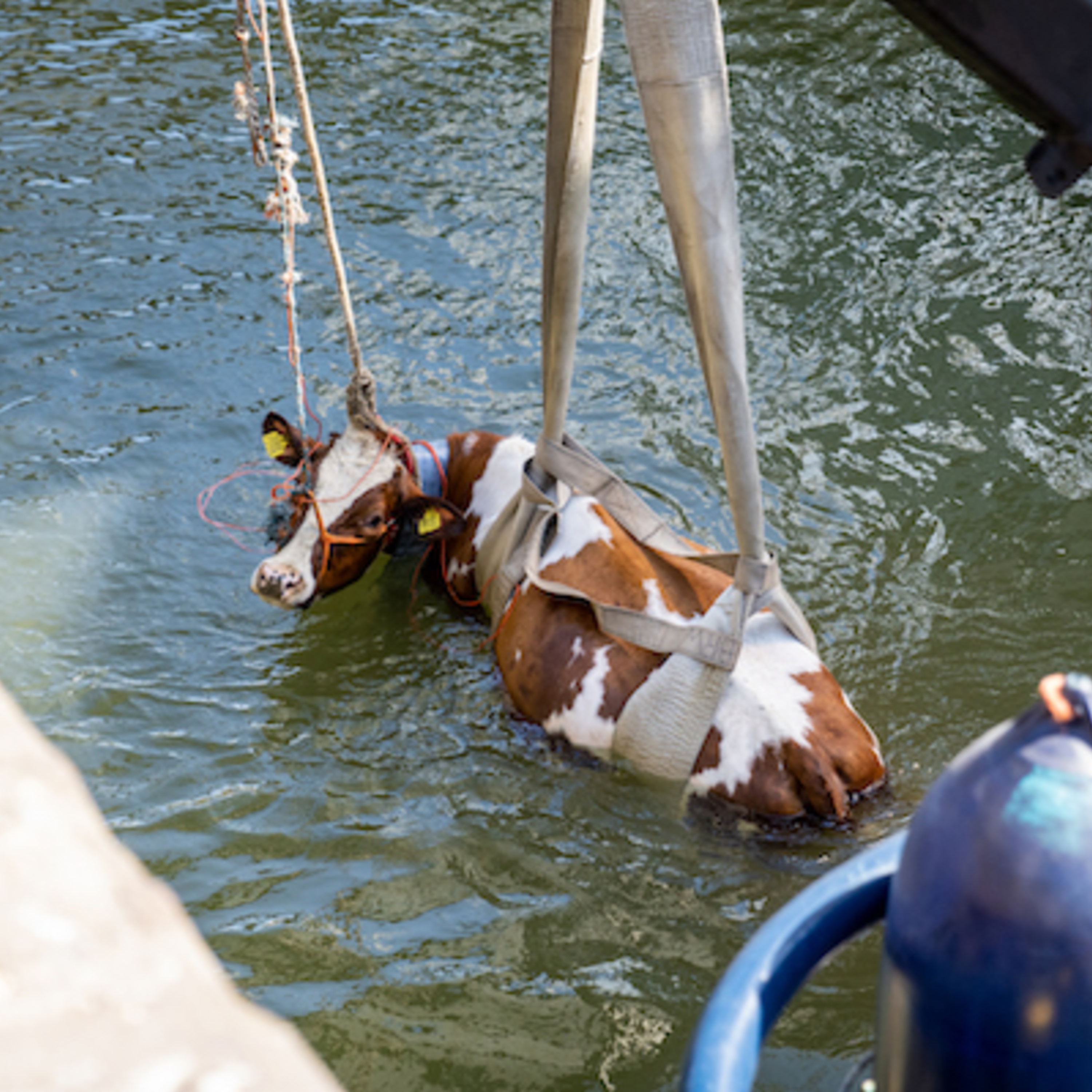 Még képek kiemelt tehenekről (https://www.dutchnews.nl/news/2021/05/rotterdam-floating-farm-criticised-after-cow-falls-into-the-water/)