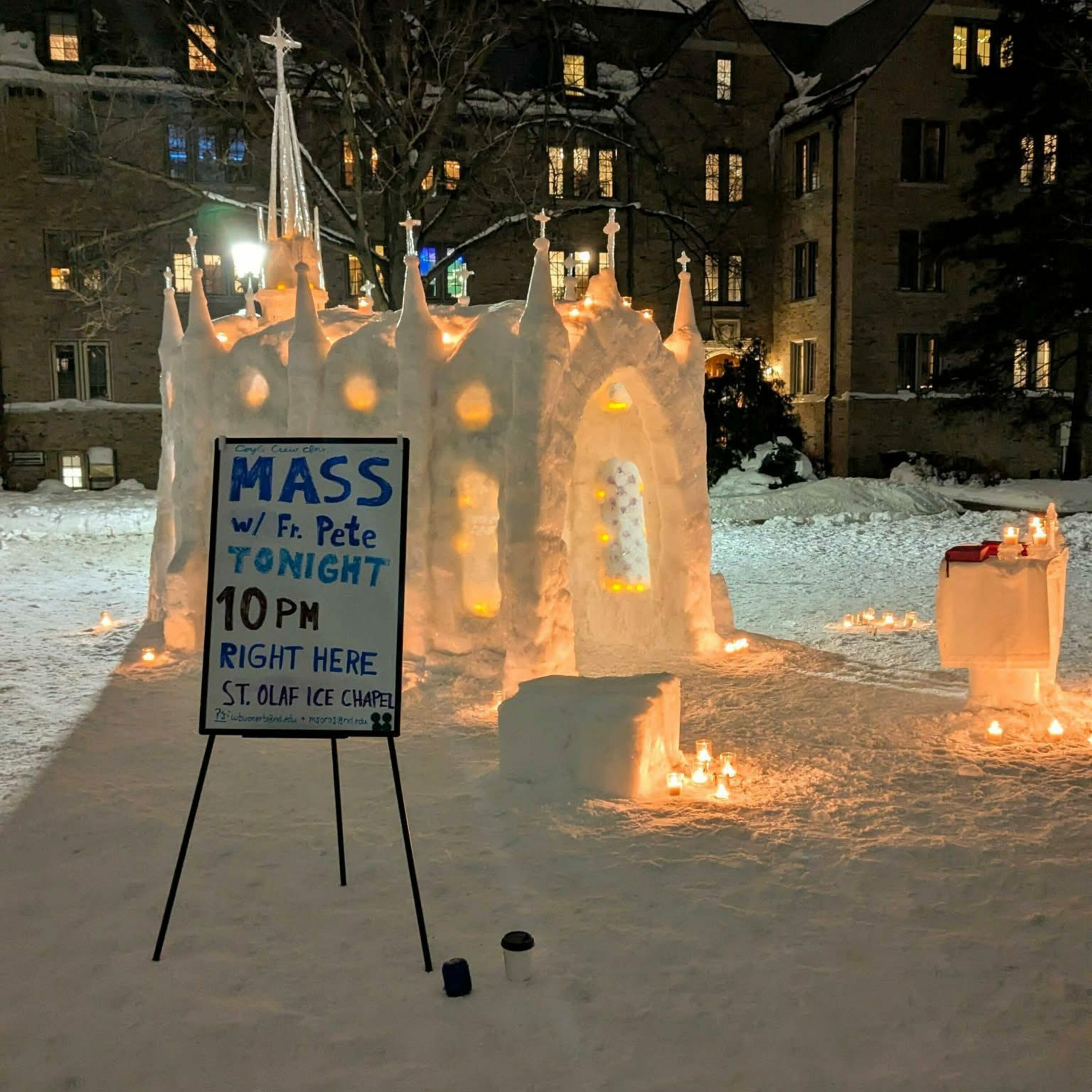 We're Catholic...we build chapels out of ice on the North Quad of Notre Dame and we bless throats with candles tied together with red ribon in Catholic school courtyards on the third of February.