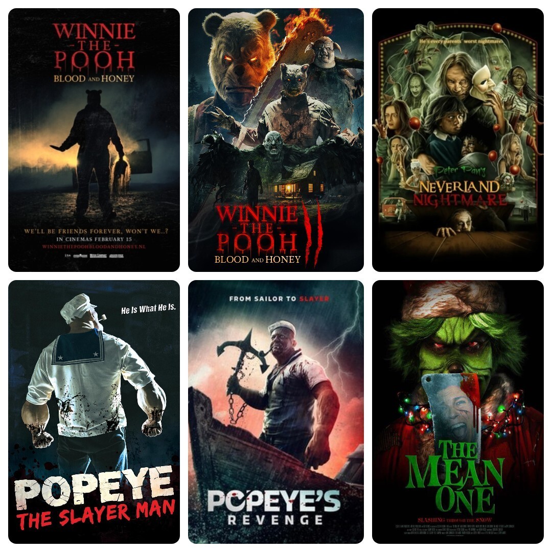 Over the past few years , several beloved childhood characters have fallen into the realm of public domain , and due to this have been turned into horror movie villains . For this episode, I sit down to talk about a few of them including, " Winnie The Pooh : Blood And Honey " ( 2023 ), " Winnie The Pooh : Blood And Honey II " ( 2024 ) , " Peter Pan's Neverland Nightmare" ( 2025 ) , " Popeye The Slayer Man " ( 2025 ) , " Popeye's Revenge " ( 2025 ), " The Mean One " ( 2022 ) and several others