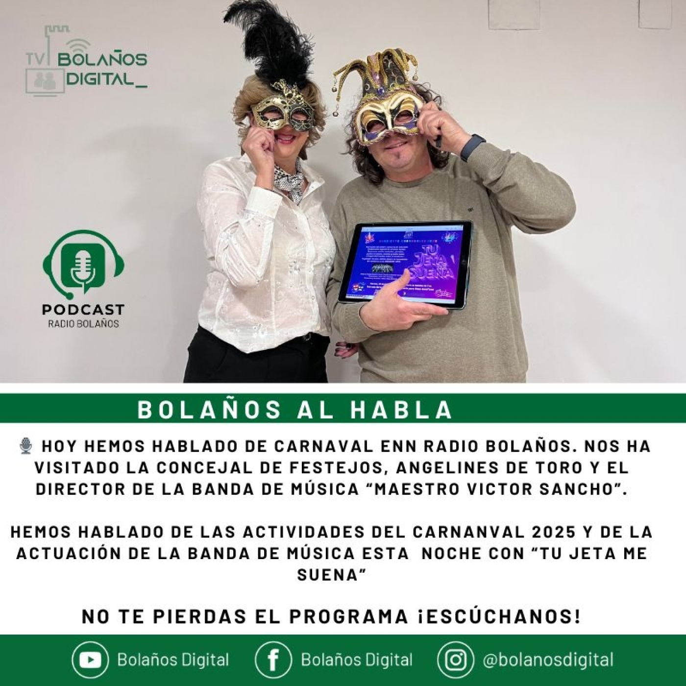 🎙️ HOY HEMOS HABLADO DE CARNAVAL ENN RADIO BOLAÑOS. NOS HA VISITADO LA CONCEJAL DE FESTEJOS, ANGELINES DE TORO Y EL DIRECTOR DE LA BANDA DE MÚSICA “MAESTRO VICTOR SANCHO”.