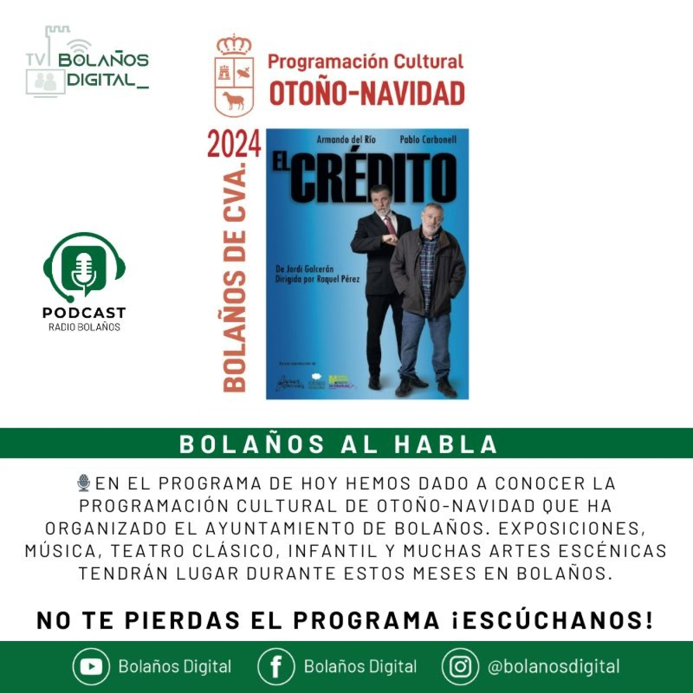 🎙En el programa de hoy hemos dado a conocer la Programación Cultural de Otoño-Navidad que ha organizado el ayuntamiento de bolaños. exposiciones, música, teatro clásico, infantil y muchas artes escénicas tendrán lugar durante estos meses en bolaños.