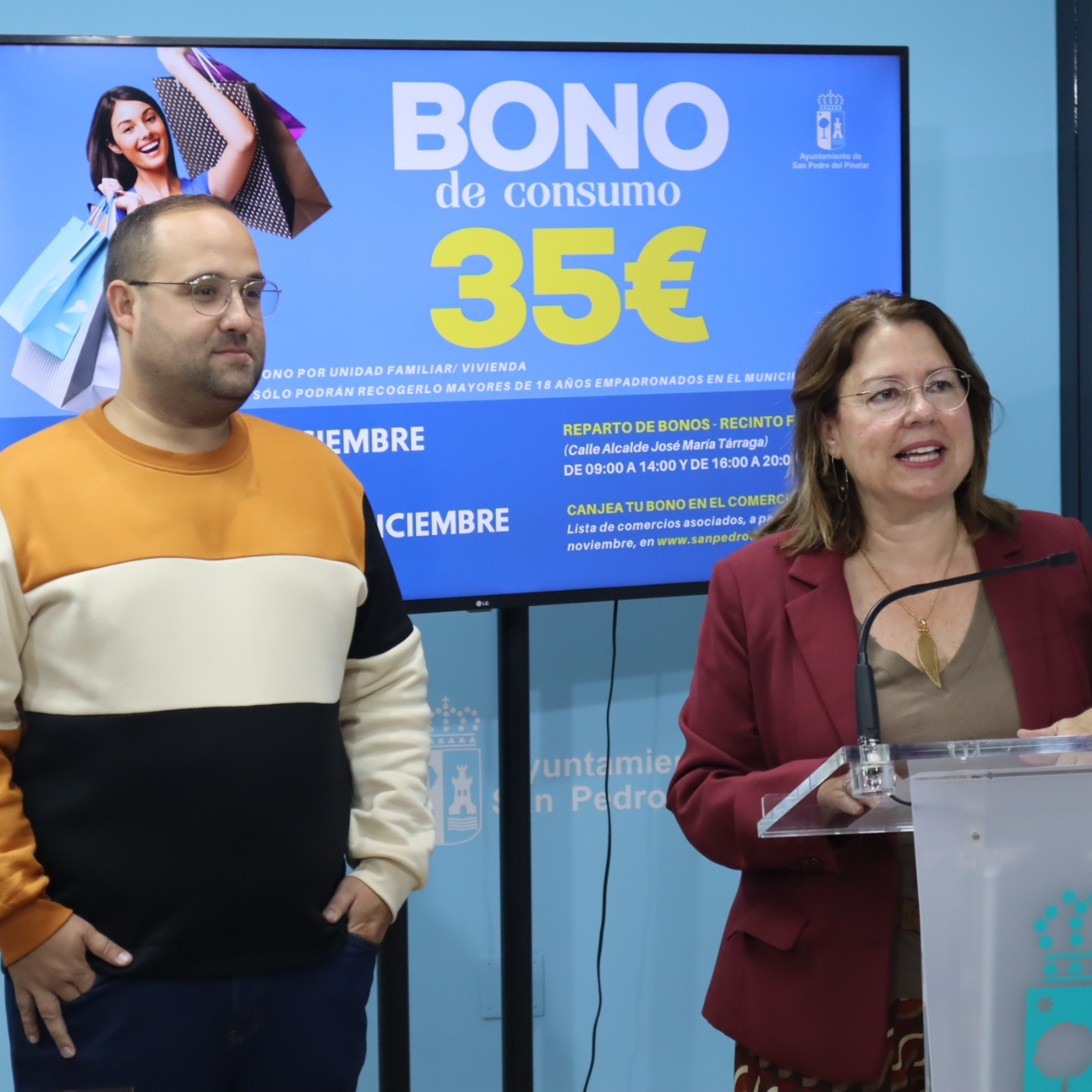 La alcaldesa de San Pedro del Pinatar, Visitación Martínez, ha presentado hoy en rueda de prensa la nueva campaña para la reactivación de la economía local, a través de la emisión de bonos de consumo, que se llevará a cabo durante la primera quincena de diciembre.