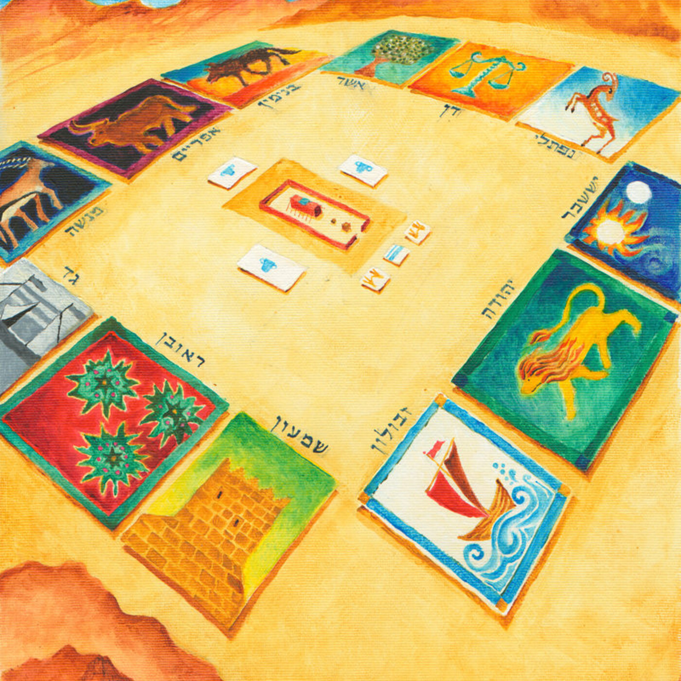 Más allá del círculo de los Levitas, las doce tribus acampaban en cuatro grupos de tres tribus cada uno. Hacia el este estaban las tribus de Iehuda (pob. 74.600), Isajar (54.400) y Zvulún (67.400); al sur Reubén (46,500), Shimón (59,300) y Gad (45,650); al oeste Efraím (40,500), Menashé (32,200) y Binamín (35,400); y al norte Dan (62,700), Asher (41,500) y Naftalí (53,400). Esta formación también era mantenida mientras viajaban. Cada tribu tenía su propio nasí (príncipe o líder), y su propia bandera con el color de la tribu y su emblema.