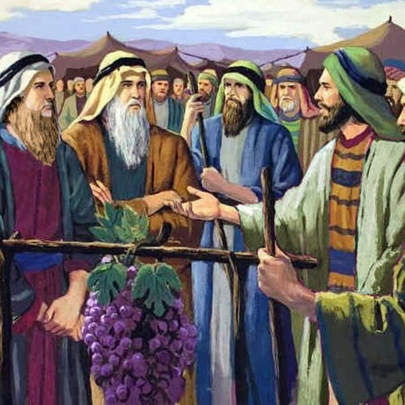 Moshe envía doce espías a la Tierra de Canáan. Estos vuelven cuarenta días después, cargando un enorme racimo de uvas, una granada y un higo, para reportar sobre una exuberante y bondadosa tierra. Pero diez de los espías advierten que los habitantes de la tierra son gigantes y guerreros "más poderosos que nosotros"; sólo Caleb y Yahoshúa insisten en que la tierra puede ser conquistada, como Elohim indicó.