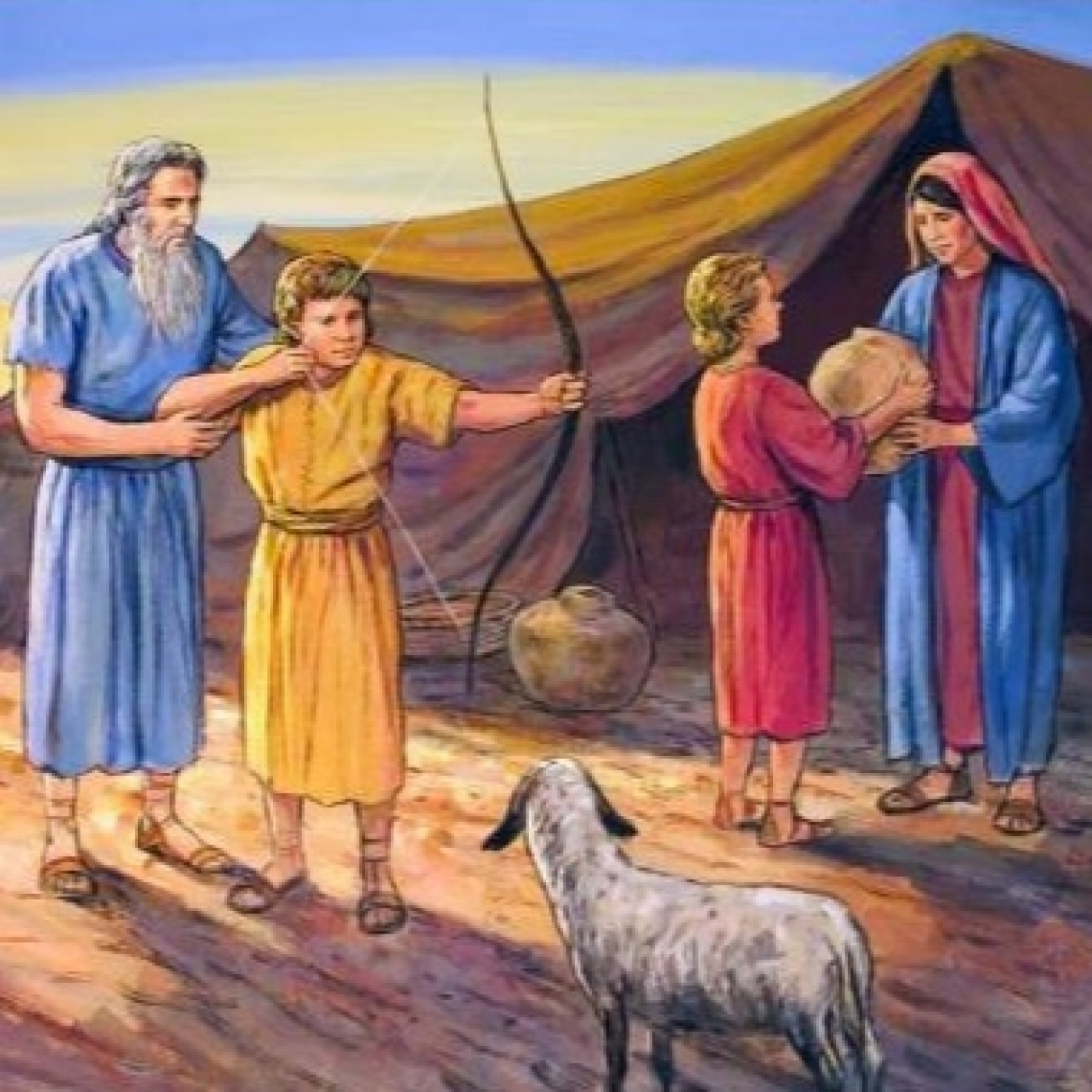 Eisav sale primero. Iaacov nace tomando el talón de Eisav. Eisav crece para ser un “cazador, un hombre del campo”; Iaacov es un “hombre completo”, un habitante de las tiendas del estudio. Itzjak prefiere a Eisav, Rivka a Iaacov. Volviendo exhausto y hambriento del campo luego del día de caza, Eisav vende a Iaacov los méritos que le corresponden como primogénito por un guiso de lentejas rojas.