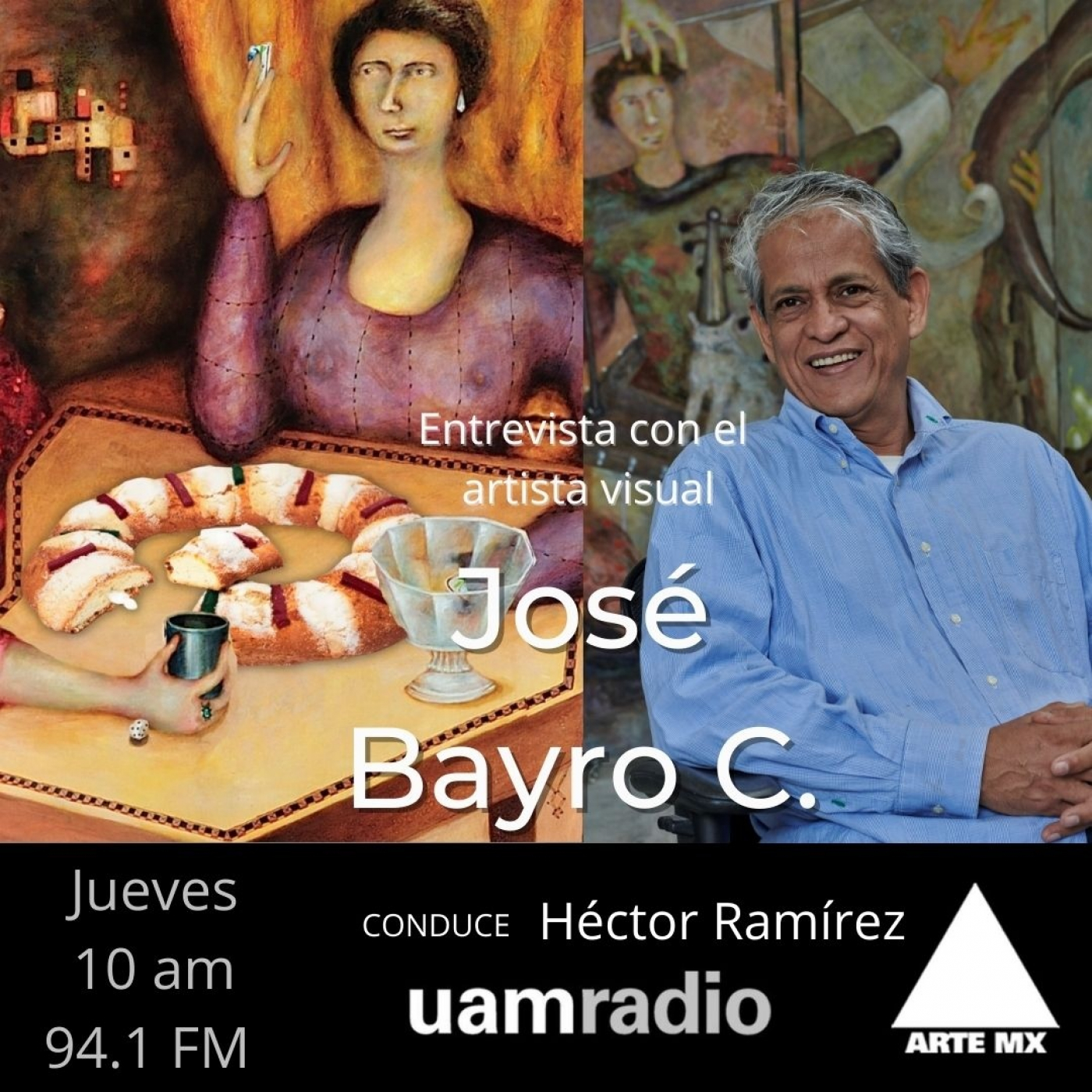 José Bayro es un artista boliviano que reside y produce desde hace bastante tiempo en México, más concretamente en el Estado de Puebla. Aunque su formación profesional es la de arquitecto, Bayro realizó estudios en artes plásticas y esa ha sido su pasión. Su creatividad e inquietud le han llevado a explorar diversas técnicas como la pintura, el dibujo, la escultura y el arte objeto. En esta charla nos habla de sus orígenes, de sus actividades como la academia de artes que dirige desde hace tiempo y de sus planes a futuro.