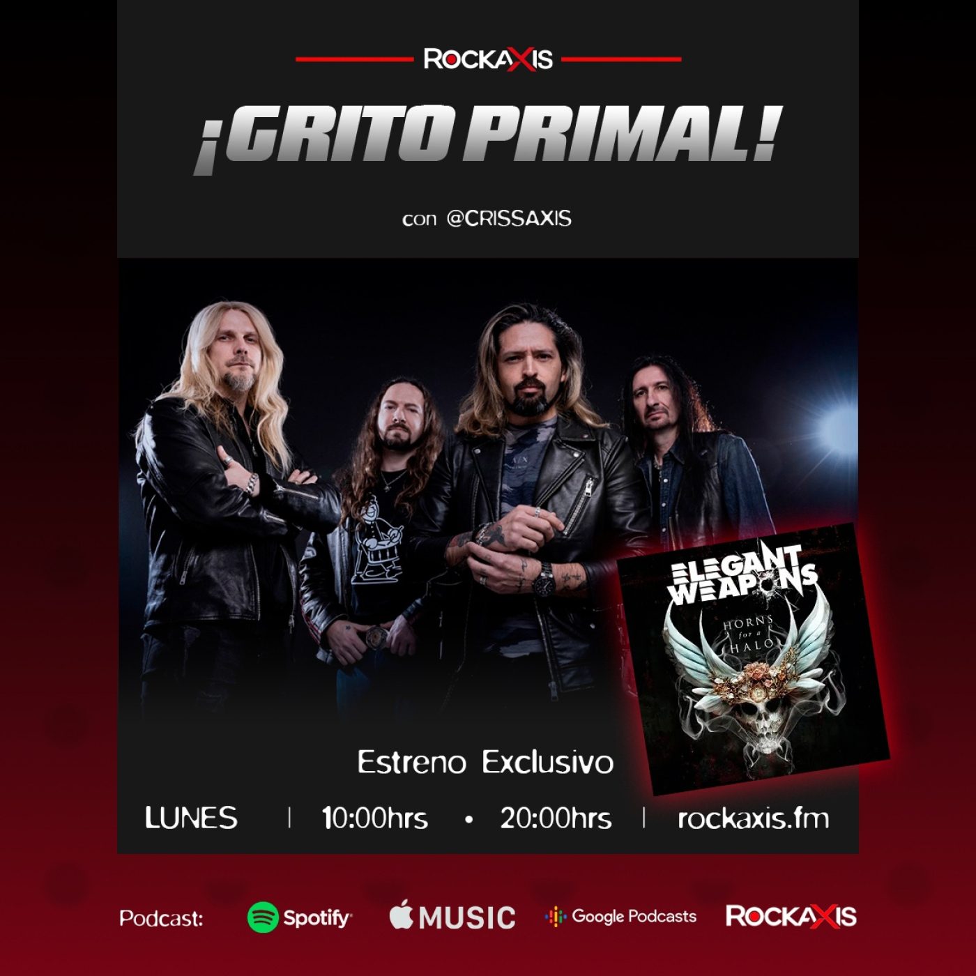 Este lunes en #GritoPrimal Programa 09, presentamos en exclusiva el disco debut de ELEGANT WEAPONS, la nueva banda de Richie Faulkner y Ronnie Romero. Imperdible! La casa del Hard 'N' Heavy, cada lunes a las 10 y 20 Hrs y repetición los sábados a las 12 Hrs, sólo aquí en 'Grito Primal' de Rockaxis! - Podcast en iTunes, Apple Music, Google Podcast y Spotify. Conduce: @CrissAxis - Invita: @Bigstore_cl