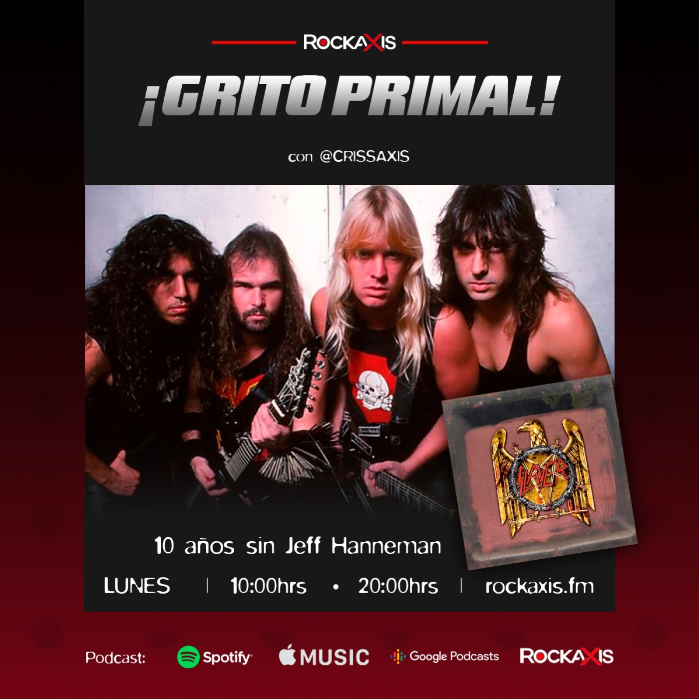 Este lunes en #GritoPrimal Programa 10, tendremos un gran homenaje a los 10 años de la partida de JEFF HANNEMAN de Slayer. Imperdible! La casa del Hard 'N' Heavy, cada lunes a las 10 y 20 Hrs y repetición los sábados a las 12 Hrs, sólo aquí en 'Grito Primal' de Rockaxis! - Podcast en iTunes, Apple Music, Google Podcast y Spotify. Conduce: @CrissAxis - Invita: @Bigstore_cl