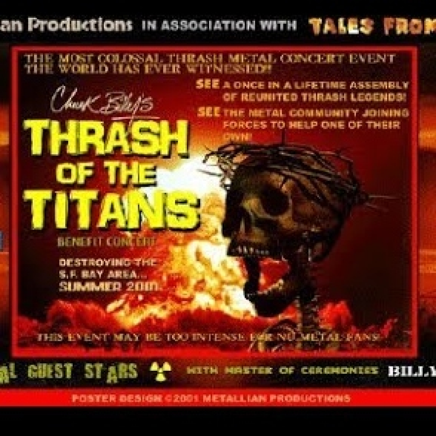 Queremos dedicar este primer programa especial para mecenas al grandísimo evento que se realizó en 2001 en San Francisco, bajo el nombre THRASH OF THE TITANS. Evento que sirvió para recaudar fondos y ayudar a CHUCK BILLY y CHUCK SCHULDINER en sus respectivas luchas contra el cáncer.