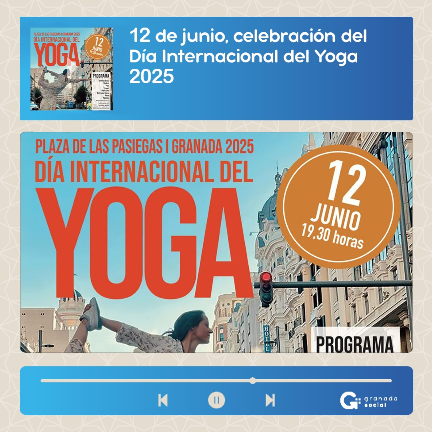 Con motivo del próximo día internacional de yoga, entrevistamos una vez más a Chaitali de la Academia de Yoga y Dharma que nos cuenta en que consiste este día y todas las actividades de las que podrán disfrutar los asistentes al evento de celebración de este día que organizan el 12 de junio a las 19:300 en la Plaza de las Pasiegas. Toda la información en el podcast completo.