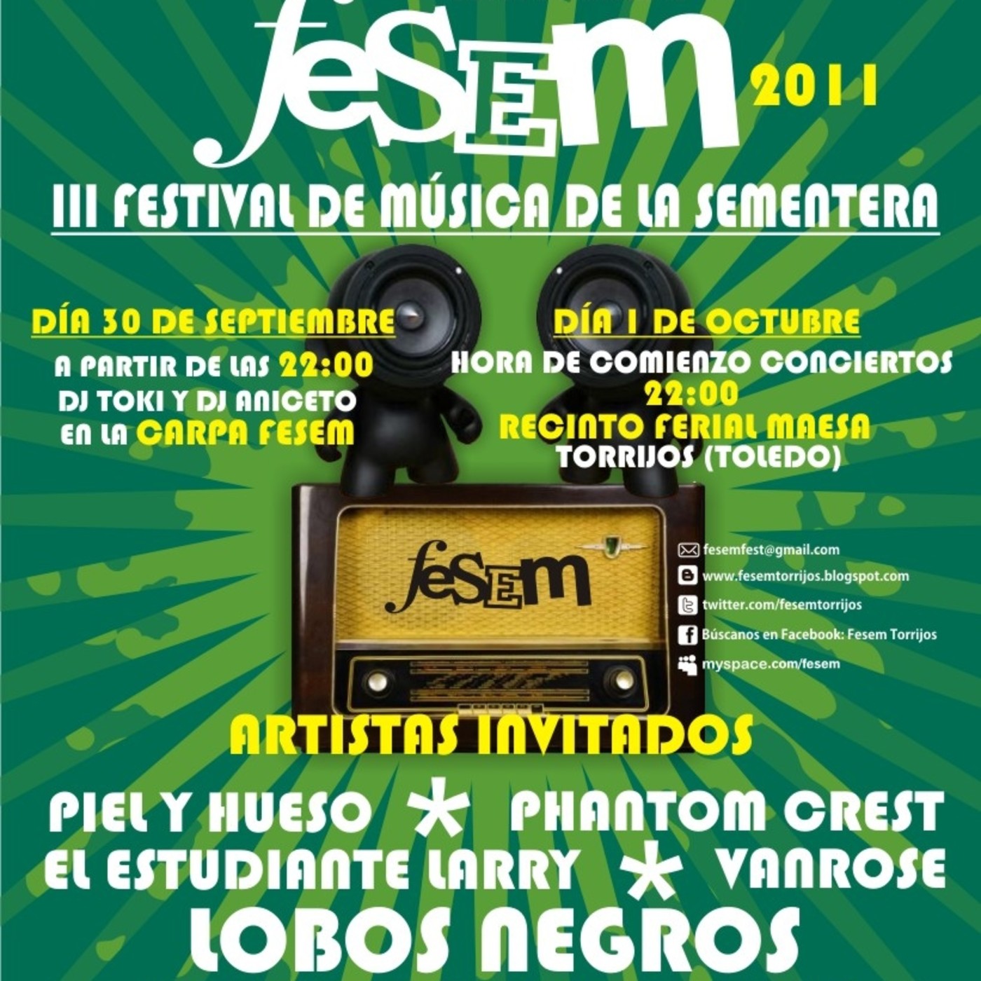 [Emitido 15/09/2011] En este nuevo programa hago un repaso a los grupos que participarán en la 3ª Edición del Festival de Música de la Sementera - FESEM que se realiza en Torrijos por tercer año consecutivo coincidiendo con las fiestas. A parte de realizar este programa también colaboro con la Asociación Fesem, así que, aunque este año he tenido que ver menos con la elección del cartel y la organización, sí que quería aprovechar este espacio para dar a conocer, entre los torrijeños, a esas bandas que van a participar, especialmente a Lobos Negros, una banda de R&R de aquí cerquita, de Talavera de la Reina, que llevan casi 30 años tocando.