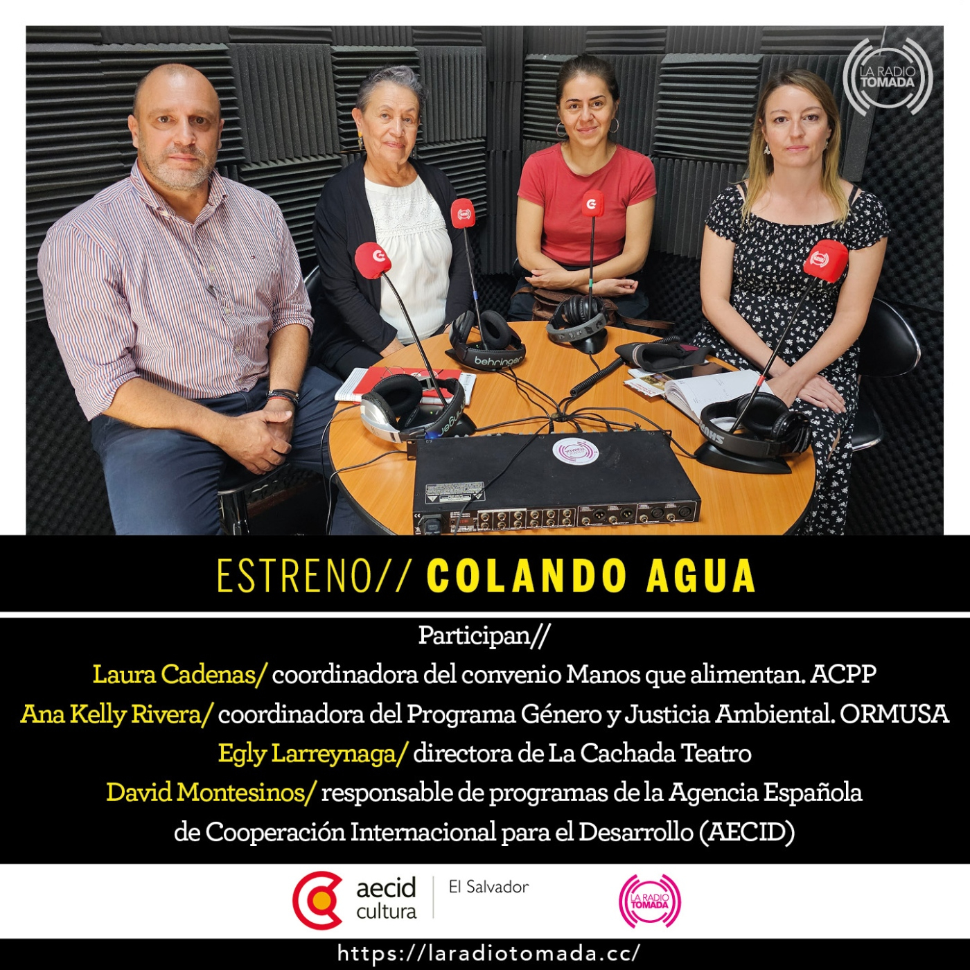 Por eso, hoy nos visitan Laura Cadenas, coordinadora del convenio Manos que alimentan, de Asamblea de Cooperación Por la Paz (ACPP); Ana Kelly Rivera, coordinadora del Programa Género y Justicia Ambiental de la Organización de Mujeres Salvadoreñas por la Paz (ORMUSA); Egly Larreynaga, directora de La Cachada Teatro, y David Montesinos, responsable de programas de la Agencia Española de Cooperación Internacional para el Desarrollo (AECID).