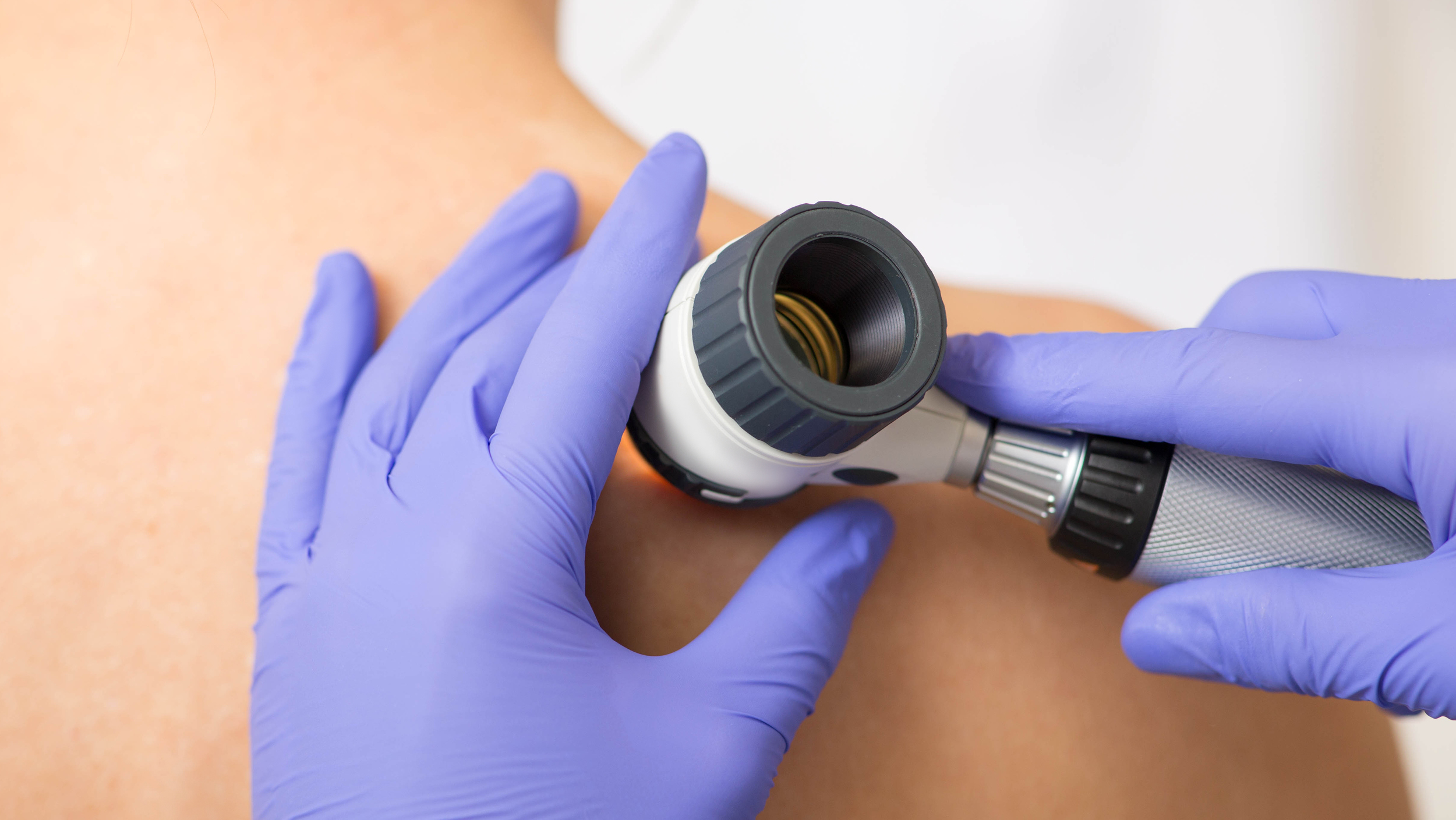 Dr Annika Smith from the Melanoma Institute Australia demonstrates how to use a dermatoscope when performing a skin check on a patient. This tool increases diagnostic accuracy of melanoma by about 15 times, versus the naked eye alone.