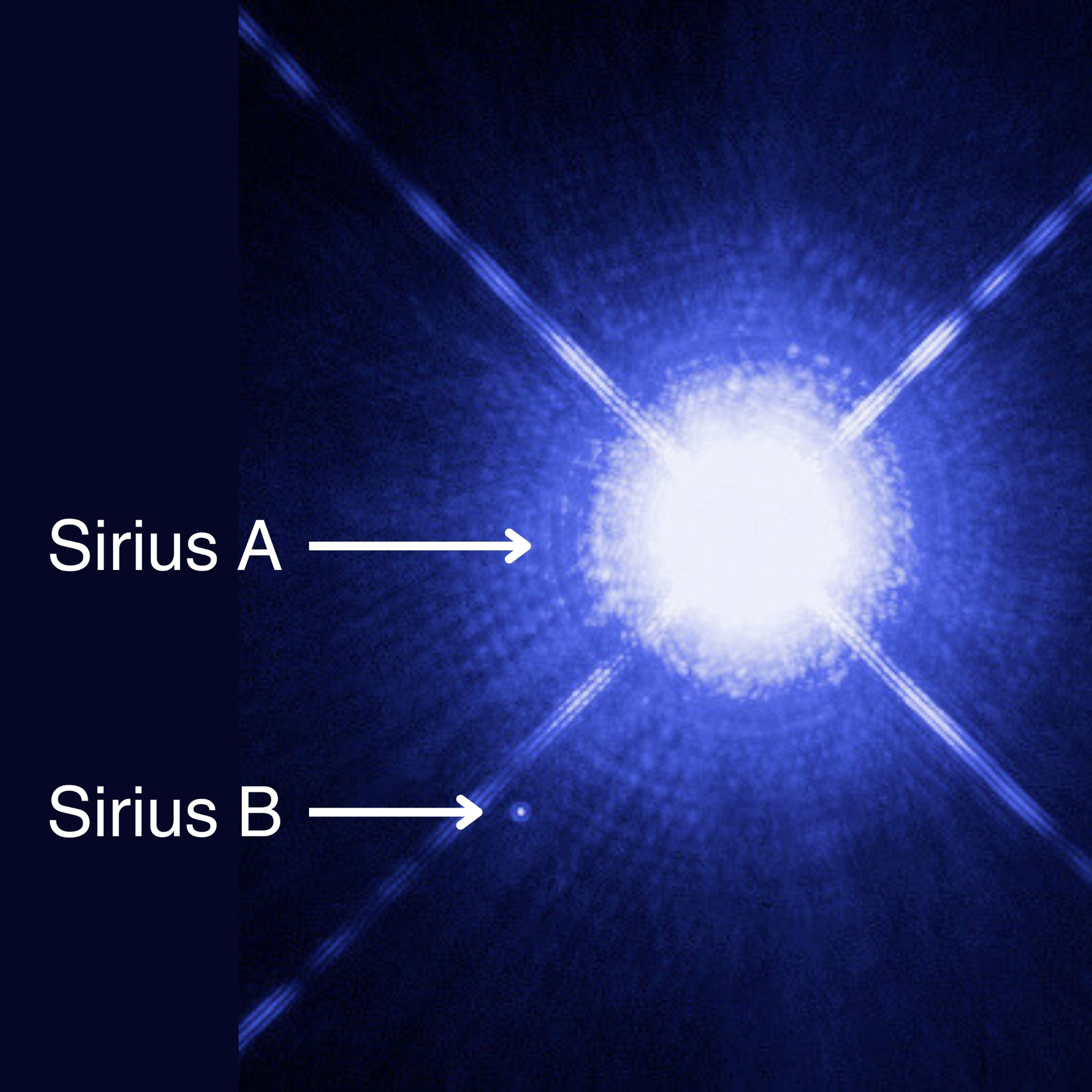 Image: Sirius A and B, hubble photo, NASA, ESA, H. Bond (STScI), and M. Barstow (University of Leicester), PD, Wikimedia Commons, changes made.