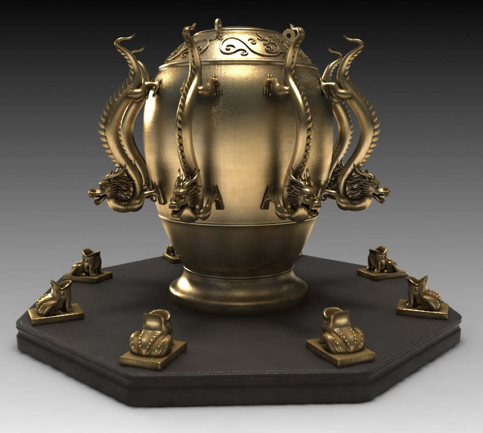 | Ancient Chinese Seismoscope. The spheres held in the dragons' mouths would drop into the mouths of the frogs, indicating the direction of an earthquake. |