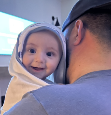The pictures is my grandson with his daddy. What a smile!