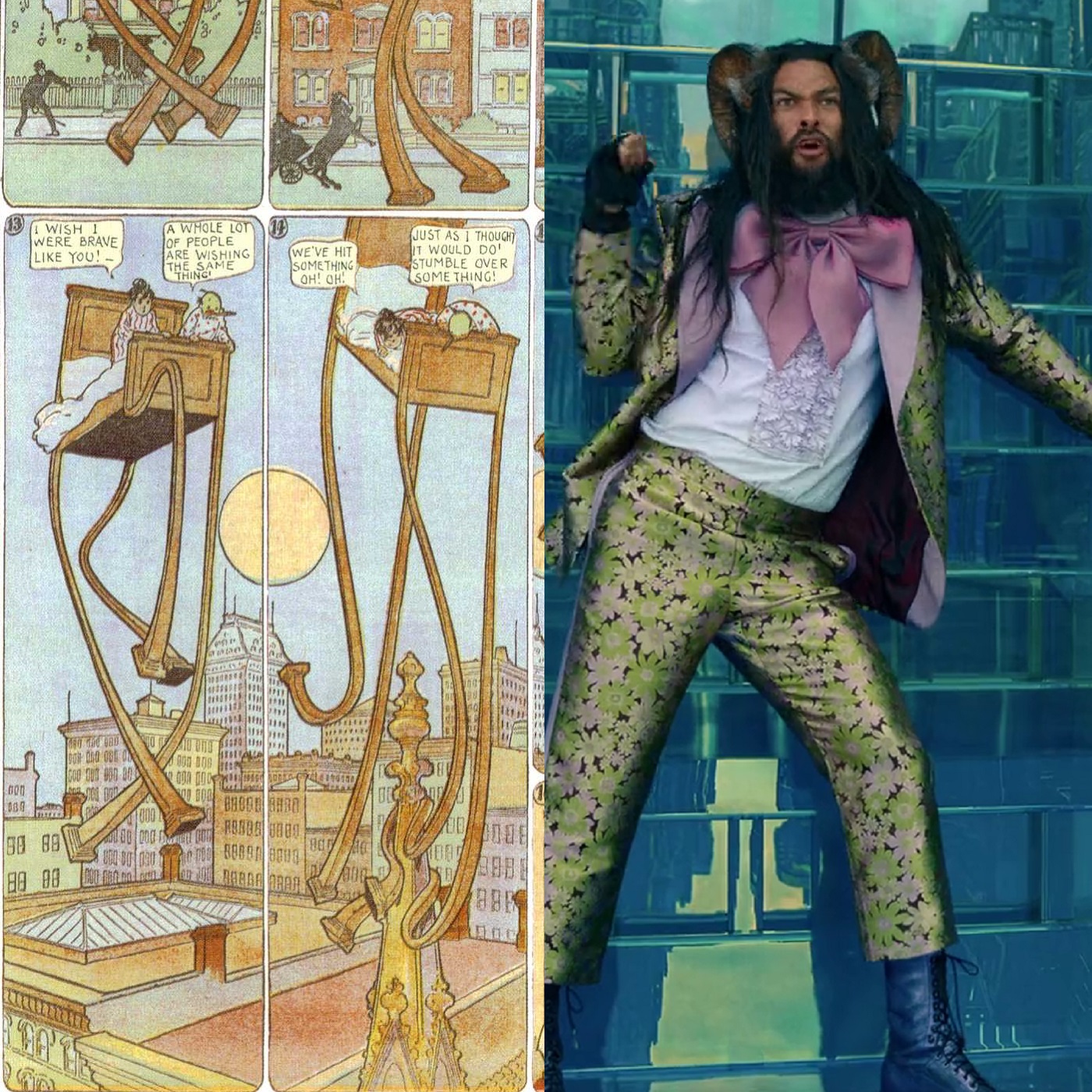 In the left corner... "Little Nemo in Slumberland" the Sunday comic strip (1905-1927) by Winsor McCay! And in the right corner... "Slumberland" the movie (2022), directed by Francis Lawrence; and starring Marlow Barkley, Jason Momoa, and Chris O'Dowd!