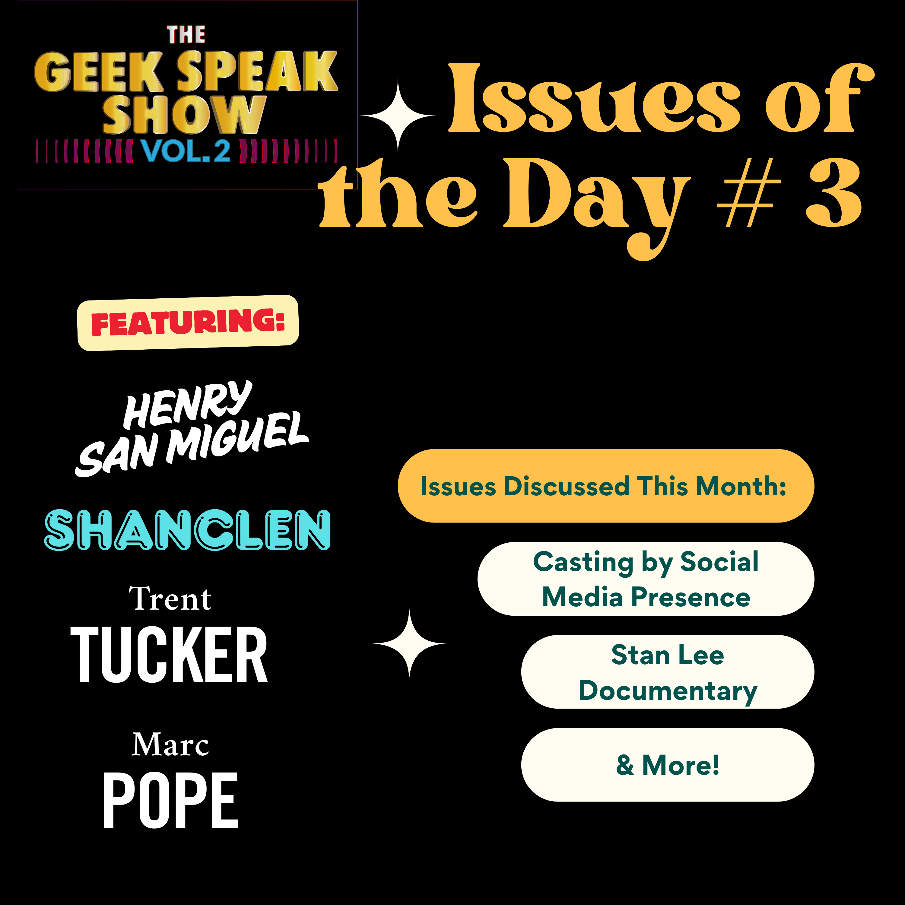 The Geek Speak Show, Vol. 2 returns from a short break with this month's Issues of the Day episode. For the first time in 2025, the entire crew is together! Henry & Shanclen are joined by Geek Off The Street's Marc Pope & Trent Tucker as they discuss what's happening in Geek Culture. The show starts with an announcement that makes Shanclen happy, followed by a discussion on movie studios casting & greenlighting projects according to social media presence rather than talent. In a landscape filled with sequels, prequels, reboots and remakes, where can you find original movies to watch? A Kickstarter just launched for a documentary about the elder abuse experienced by Stan Lee at the end of his life. The guys discuss whether this is truly coming frm someone who cared about Stan & wants to bring this to light...or is it one final cash grab seven years after Stan has been gone?