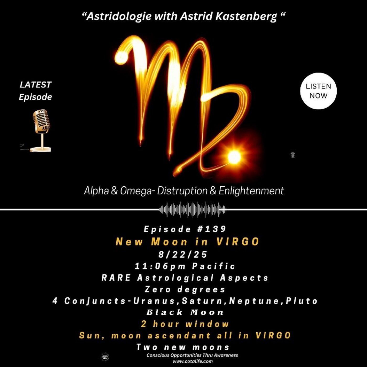 This Virgo New Moon is the first of two rare moons in the sign of Virgo. The aspects surrounding these two new moons are nothing short of historical and amazing. Virgo wants us to focus on our well being and reset, organize and restructure all areas of our lives. Summer fun is ending and it is time to return "back to school" and the foundations of our lives. listen and learn some incredible information about this extraordinary lunation period.
