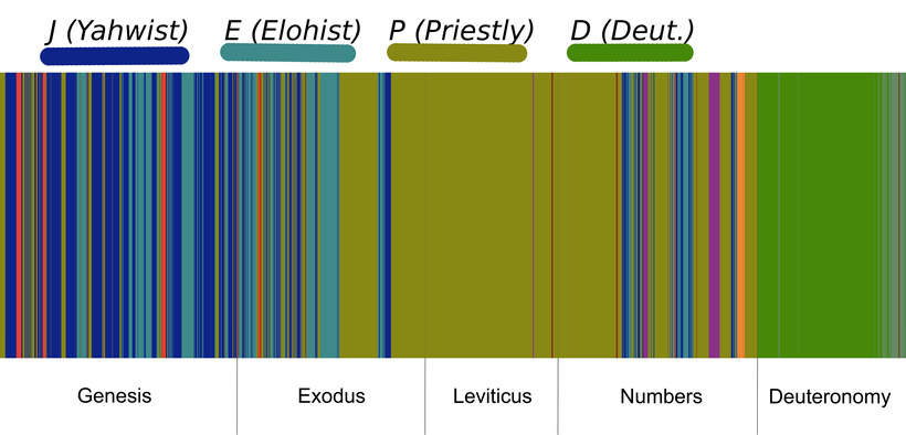 A link to Joel Baden's division of the Pentateuch rendered in KJV, and handy chart showing the composition of the Torah's sources according to his division: