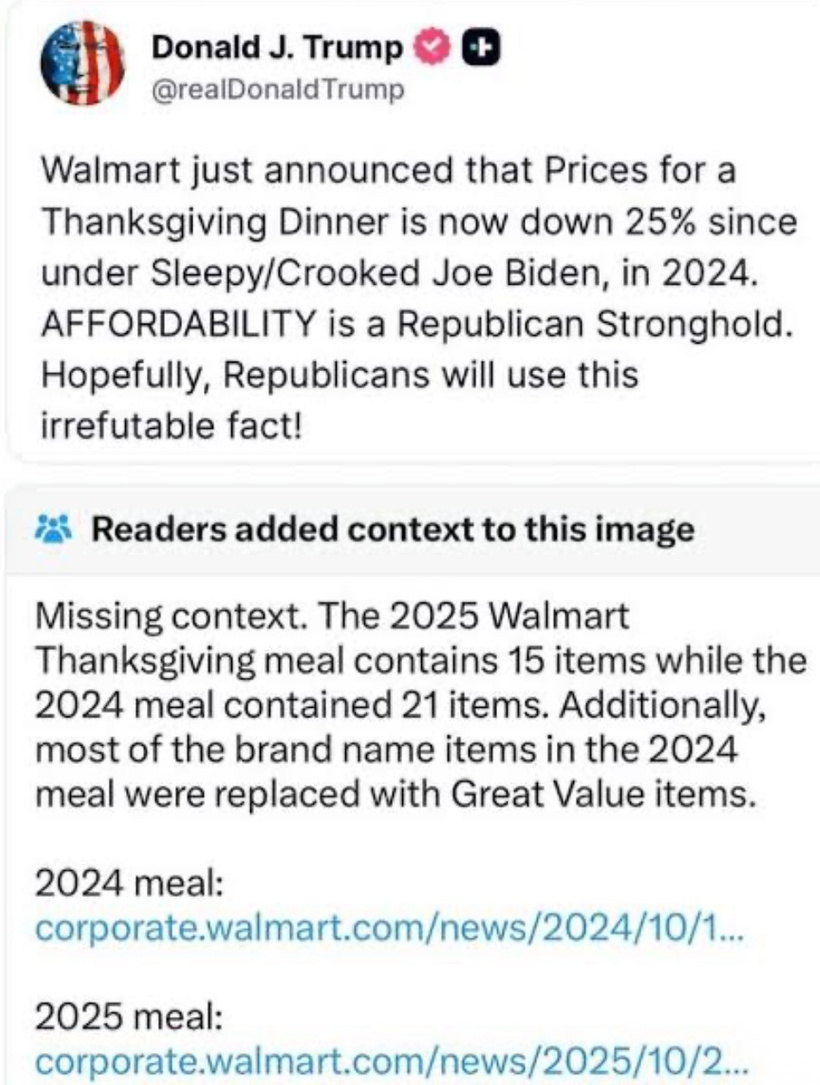 (44:58) TWEET Trump cites Wal-Mart Thanksgiving meal price as an inflation indicator, ignore the community notes