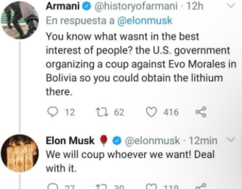 (52:25) TWEET in regards to Bolivia, Elon Musk said "we'll coup whoever we want! Deal with it."
