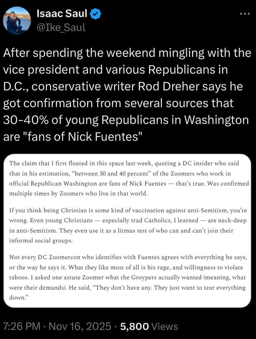 (8:02) CORRECTION: the Atlantic gave Nick Fuentes a glowing profile - The firewall against Nick Fuentes is crumbling: The white-supremacist influencer is entering the MAGA mainstream https://www.theatlantic.com/technology/2025/10/nick-fuentes-tucker-carlson-interview/684792/
