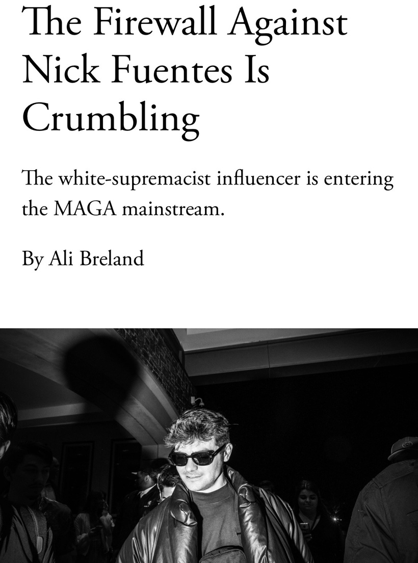 (6:17) ARTICLE The New Yorker - Nick Fuentes is not just another alt-right boogeyman: the rise of the white-nationalist streamer should worry us even more than it already does https://www.newyorker.com/news/fault-lines/nick-fuentes-is-not-just-another-alt-right-boogeyman