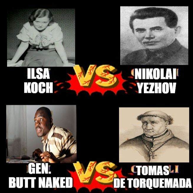 This week we round out the tournament with our last two matchups featuring Ilsa Koch vs Nikolai Yezhov and General Butt Naked vs Tomas Torquemada. Remember folks there is no winner here. Just a survivor...