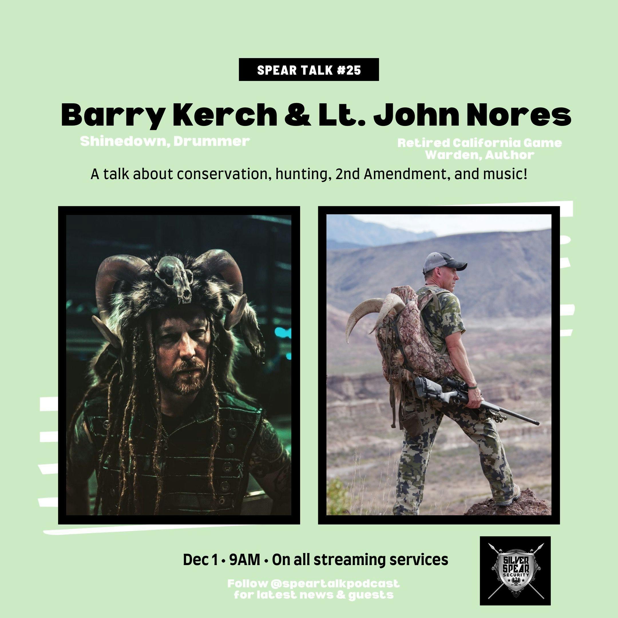 For our 25th talk, we had the honor of welcoming back Lt. John Nores, who is a retired California game warden, and first time guest Barry Kerch, who is the drummer for platinum selling rock band, Shinedown. This was an incredible discussion that covered a wide range of topics.