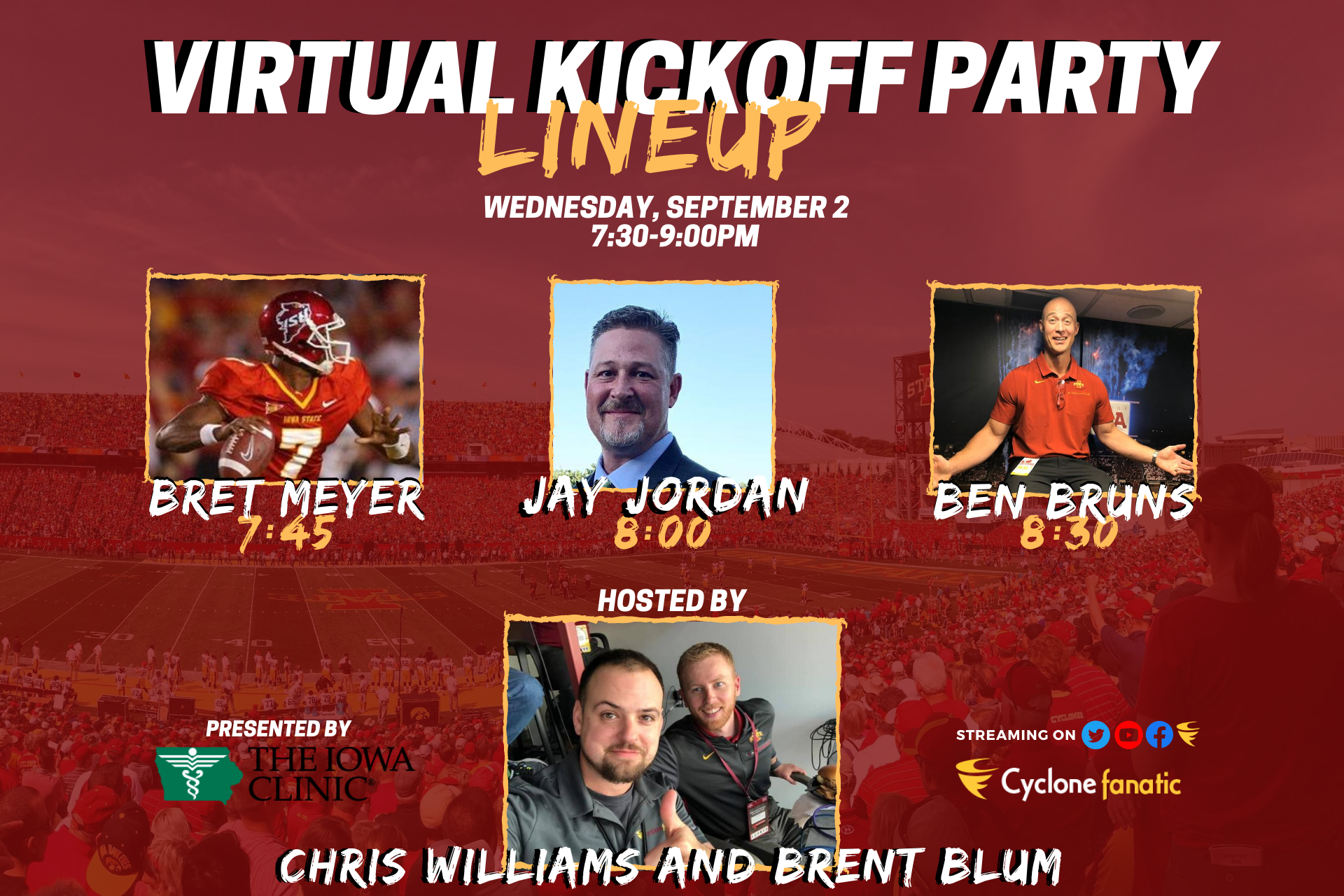 Chris Williams and Brent Blum are joined by former Iowa State quarterback Bret Meyer, CF football analyst Jay Jordan and Cyclone Radio Network analyst/sideline reporter Ben Bruns to preview the Iowa State football season on the Cyclone Fanatic Virtual Kickoff Show presented by The Iowa Clinic, which aired live on the the CF social media feeds last week.