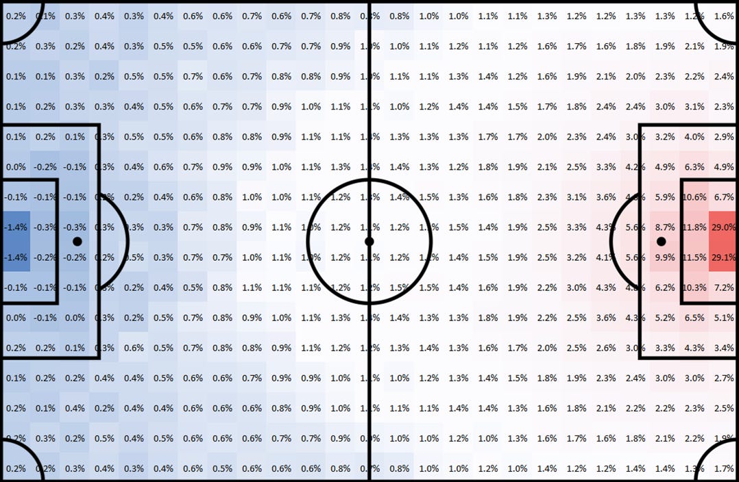 My model also works off of zones and the value of each is trained from the xG created in a possession after the ball has been in that zone, along with the probability that the other team will create xG from you having possession in that zone. Giving you a pitch that looks something like this: