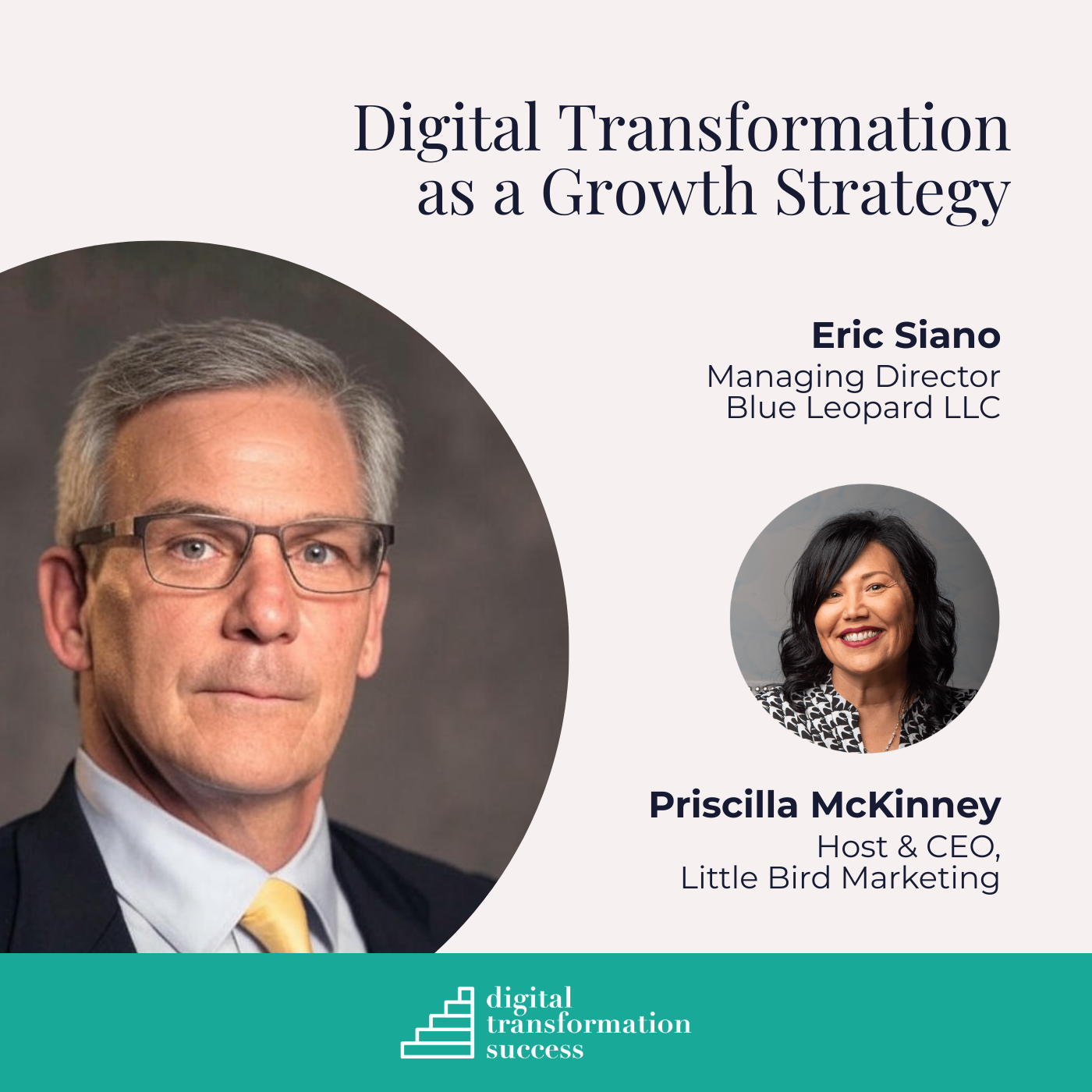 Digital Transformation Success host and Little Bird Marketing CEO Priscilla McKinney speaks with Eric Siano, Managing Director at Blue Leopard LLC about digital transformation as a business growth accelerator. They examine how companies can achieve measurable growth by rethinking current spending levels rather than demanding increased budgets. Siano shares frameworks for translating digital transformation strategy into executable go-to-market plans that impact revenue, efficiency, and cross-departmental alignment.