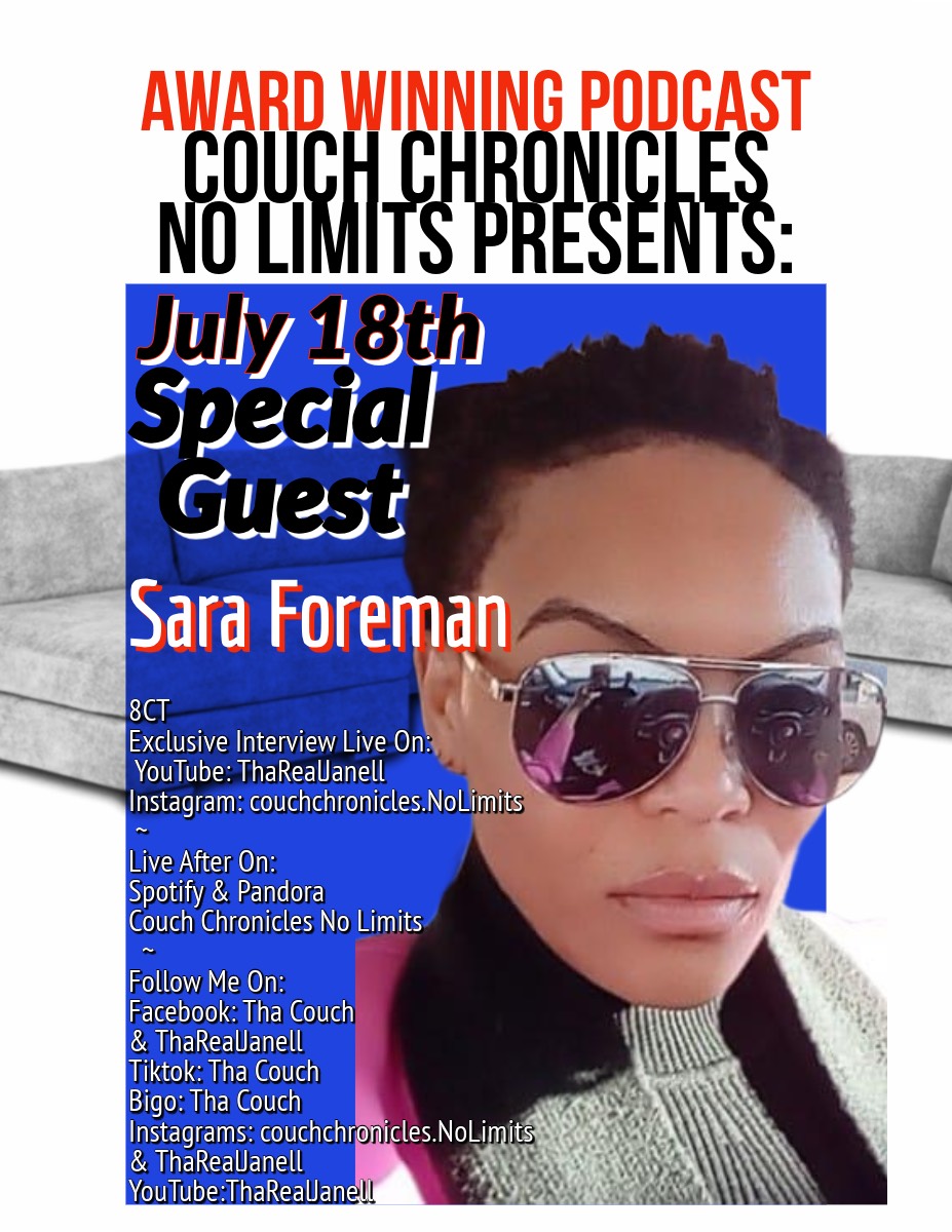 Award Winning Podcast Couch Chronicles No Limits Season 3! This month is Fibroid Awareness month Make sure to follow Sara Ana Foreman on all social media platforms to keep up with what she’s doing. Reach out if you would like to know more Make sure to follow anyone who jumps on Tha Couch Share and let someone know about Tha Couch. Did you like the show tonight ? Got some juice? want an interview? Dm me and let me Know. Make sure to follow and support Tha Couch. Make sure to follow any everyone who jumps on Tha Couch and shares their story. Wanna support? Cash app Paypal or Chime $tharealjanell Got a Special Shout Out? Birthday ? Just want to say something special to someone live on Tha Couch Email couchchroniclesnolimit@gmail.com If you miss the couch you can watch the full episodes on my YouTube channel Fb Tha Couch & you can also listen to Couch Chronicles No Limits on Spotify & Pandora Thank you so much everyone for tuning in. If you would like to be apart of the podcast dm me Come Catch a vibe every Monday, Tuesday, Thursday & Friday 8Ct Be sure to visit my website www.ThaRealJanell.com Next Mental Health Talk August 19th Fuck Fentanyl July 28th Next Prison Talk August 5th 6th 8th & 9th If you would like to speak about your experiences your more then welcome to pull up or tune in and join Have a story to share, please join and share. Your story could save a life. July 28 Tha Couch will be media for the 2nd time at the Dallas BET AWARDS 4748 ALGIERS STREET DALLAS TEXAS 75207 S/o Moneyman Rado Looking to capture your favorite moments? Sequel Studios Jenee Lancy is who you need for any Photography, Videography or even a website to be built. Book with her today Looking for custom beats? Mixing mastering ? Get with Tha Couch personal producer Michael Lawrence Mav.Gd on IG If you missed it no worries listen now on Spotify or Pandora Couch Chronicles No Limits. Tha Couch on fb tiktok & Bigo .