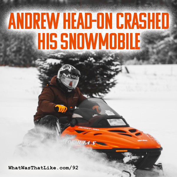 But there was this one day, he went flying up a hill and caught air, without realizing that there was someone on the other side of that hill. Someone on a snowmobile, coming TOWARD Andrew, who also was about to fly through the air, at the exact same time.
