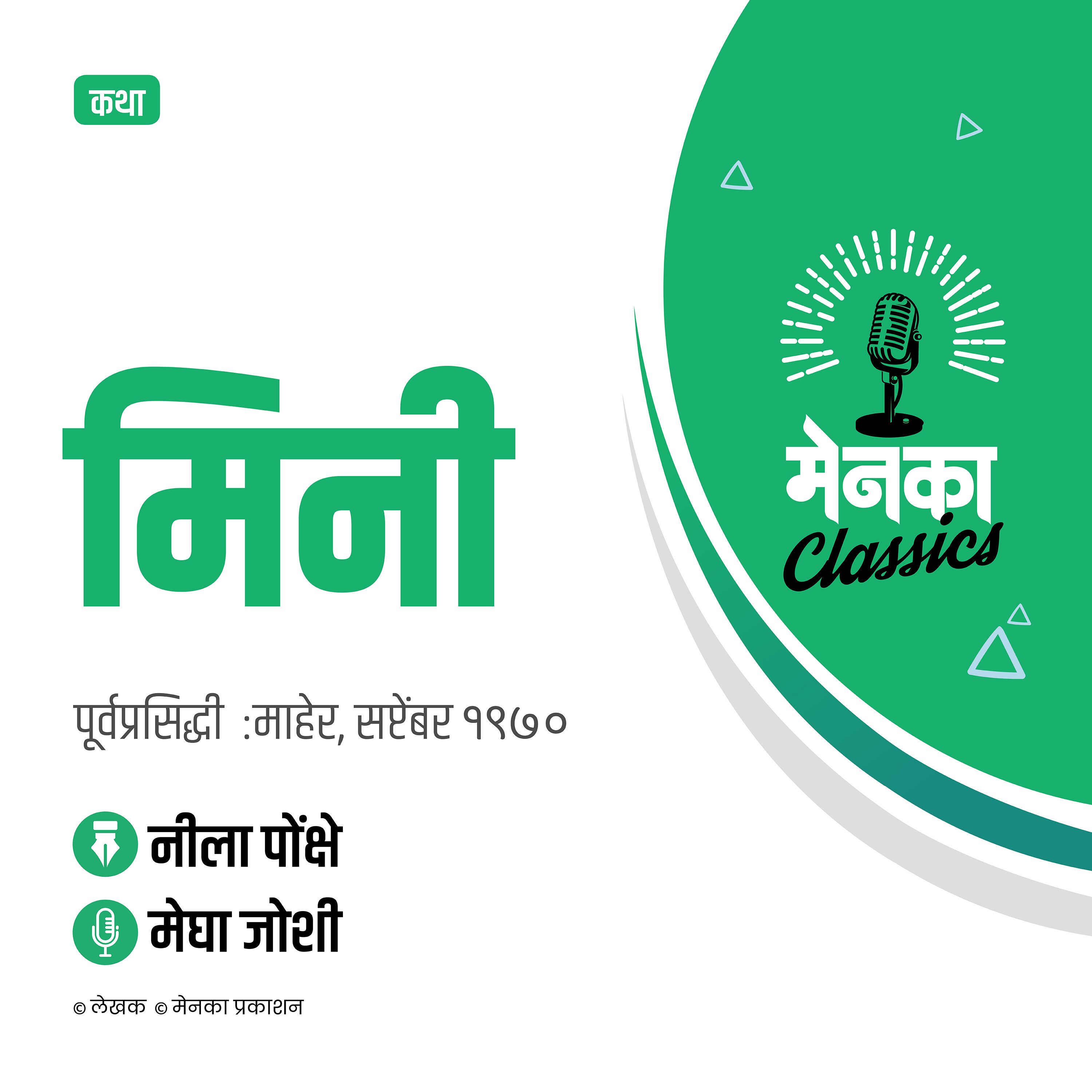 Disclaimer मराठी साहित्याच्या उज्ज्वल परंपरेचा आणि शेकडो ज्ञात-अज्ञात लेखकांच्या सृजनाचा सन्मान तसंच गतस्मृतींना उजाळा ही ‘मेनका क्लासिक्स’ पॉडकास्ट्सची मुख्य उद्दिष्टं आहेत. ‘मेनका प्रकाशना’च्या स्थापनेपासून म्हणजेच १ फेब्रुवारी १९६० पासून ‘माहेर’, ‘मेनका’ आणि ‘जत्रा’मध्ये प्रकाशित झालेल्या उत्तम कथा, लेख, किस्से, विनोद आणि इतर साहित्याची श्राव्य स्वरूपात पुनर्निर्मिती ‘मेनका क्लासिक्स’द्वारे करण्यात येत आहे. हे करत असताना पूर्वप्रकाशित साहित्याच्या मूळ स्वरूपाला कोणताही धक्का पोचू नये याची विशेष खबरदारी घेण्यात येत आहे. एका अर्थी, गेल्या सहा दशकांचा हा अमूल्य असा ठेवा आहे. त्यामुळेच आज या साहित्याचा आस्वाद घेत असताना, सामाजिक धारणांमध्ये, कायद्यात वेळोवेळी झालेल्या बदलांचा-सुधारणांचा, वर्तमानात अभिप्रेत असलेला संदर्भ यात असेलच असे नाही, याची जाणीव श्रोत्यांनी ठेवावी, ही नम्र विनंती. कोणत्याही स्वरूपाच्या जातीय, धार्मिक, भाषिक भेदांचे किंवा अनिष्ट रूढी-परंपरांचे ‘मेनका प्रकाशन’ समर्थन करत नाही.